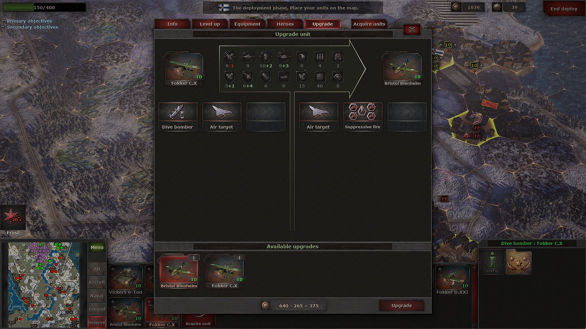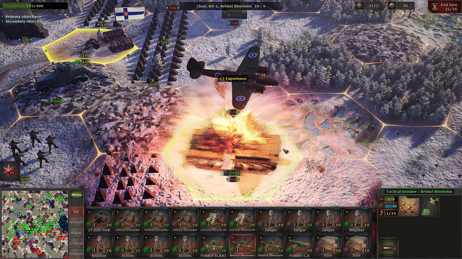 Command the Finnish ski troops and captured Soviet vehicles, including BT-7, T-34, and KV tanks. Purchase German Pz-IV tanks, StuG assault guns, and Ju-88 bombers. Make use of pre-war British Bristol Blenheim bombers, covered by Dutch Fokker and US Buffalo fighter planes.