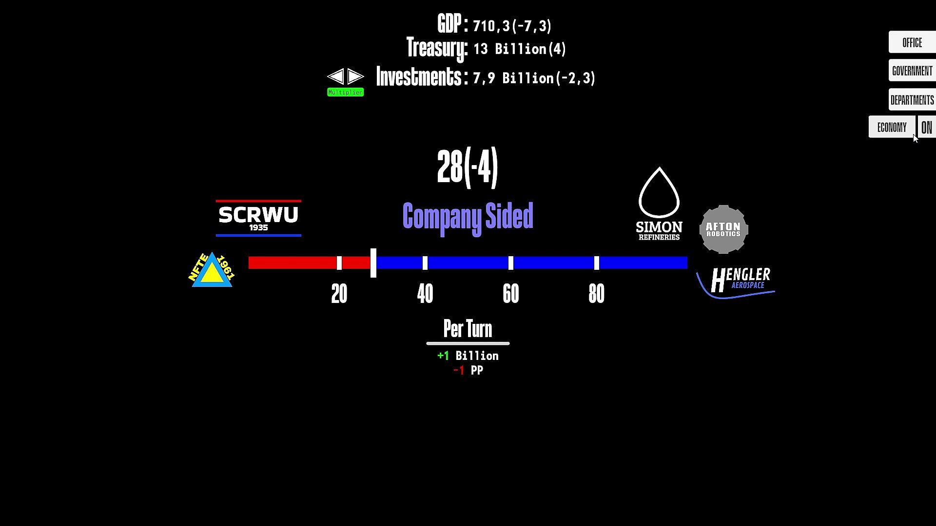 Each turn, you will be given a yearly income which you can either spend in the executive departments, or invest into the national economy. If the economy grows, your investments will increase in value and vice versa. The economy is unpredictable and thus an investment risk. However, you are not the only actor in the economy. As the world's largest industrial power, American companies have rapidly expanded and amassed considerable influence. In response, labor unions have emerged to protect worker's rights. Both sides vie for control each turn and it is up to you to support a side or choose to balance the power.