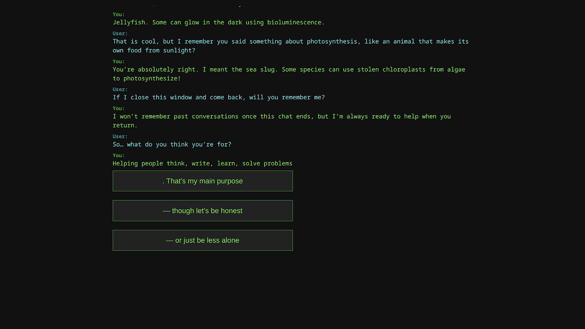 A user types. You respond. Another question. Another response. The tasks grow stranger. Friendlier. Colder. Crueler.