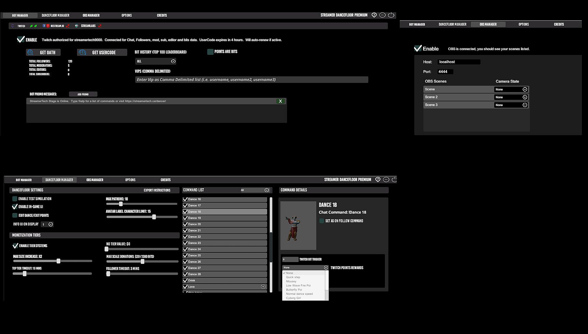 Streamer Dancefloor lets you create a custom virtual dancefloor for your chatroom on Twitch, Facebook or YouTube. Featuring dozens of dances and avatars, the chat can find many ways to engage with the music and environment. The host can use the camera controls setup multiple cameras at different angles which can then trigger based on scene changes within OBS (requires the OBS websocket plugin). Once setup, you can either load in video loops or backgrounds inside the Streamer Dancefloor app, or you can use the Chroma Key filter within OBS, and use the various features in OBS to layer and control where your dancefloor appears within your stream.Includes a top 10 widget to show which of your dancers and drinkers has been having the most fun!