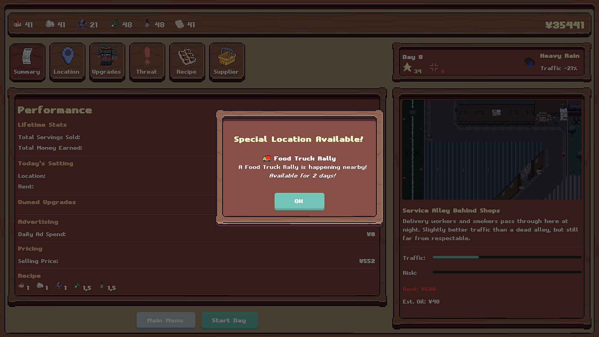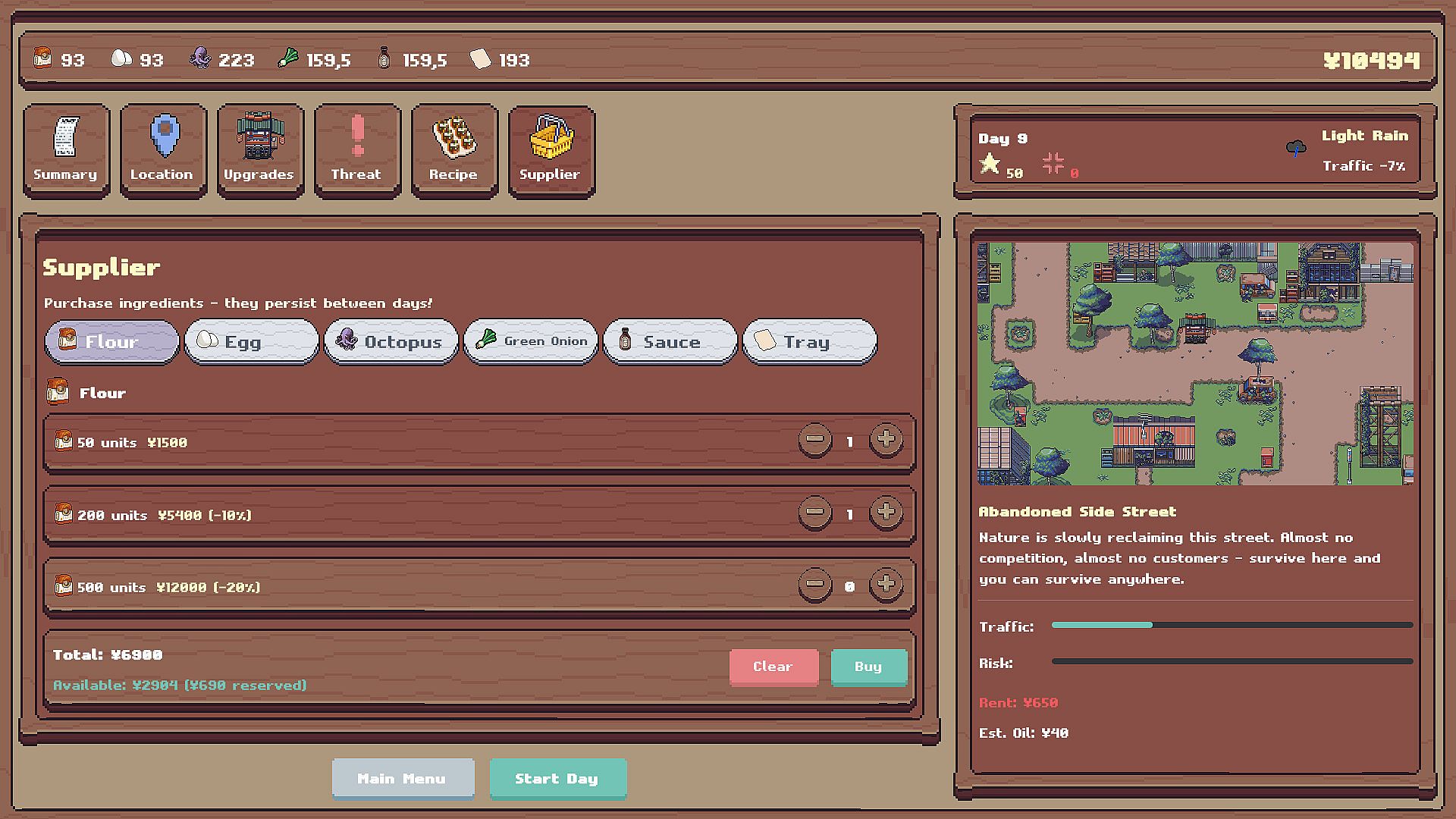 Street Takoyaki is a focused tycoon simulation game where you manage your stand in the streets of Japan. Choose where to operate, set your prices, manage ingredients, and survive the pressure as your business expands. There's no soft wins. You either adapt, or you shut down. Just like in life.