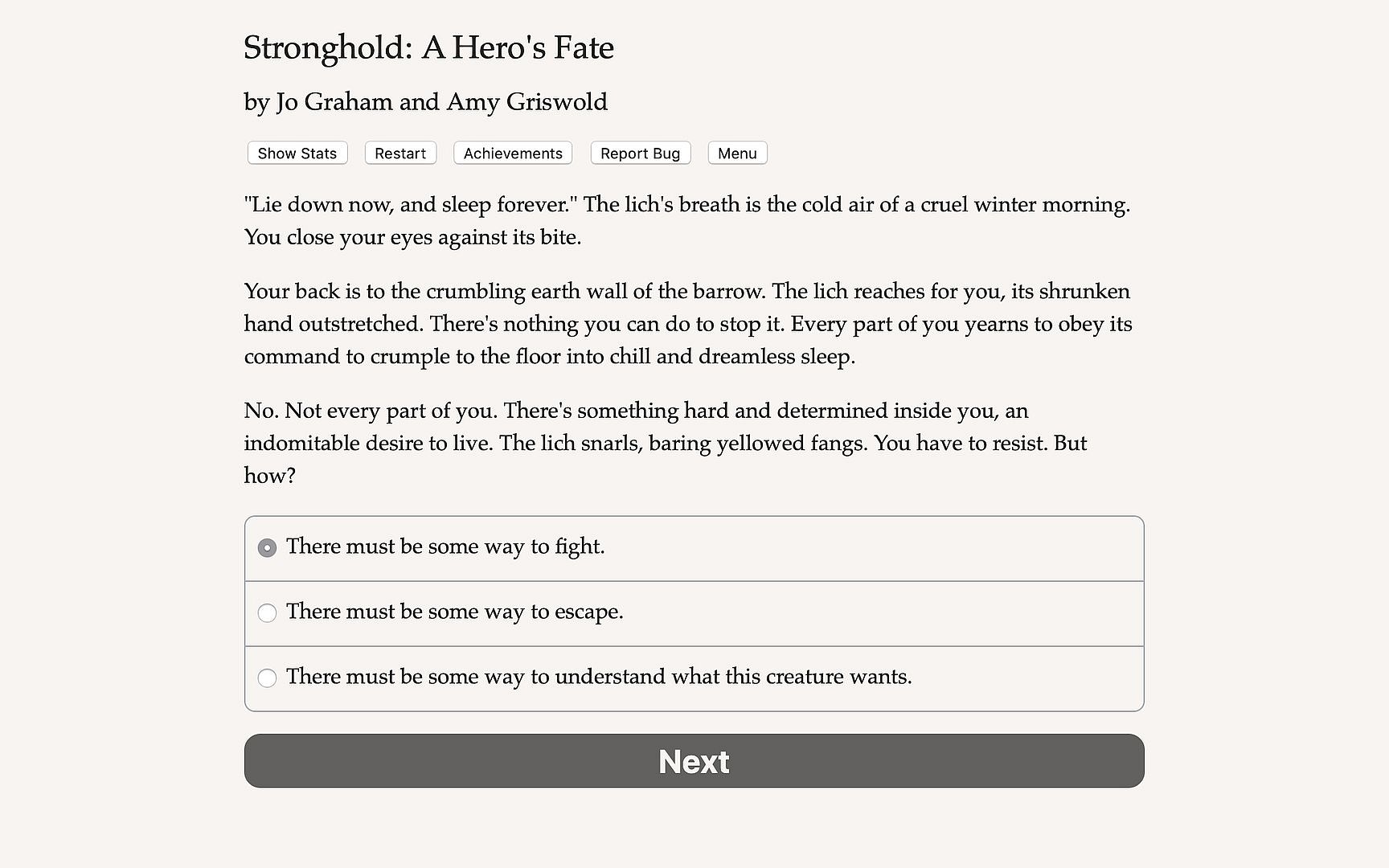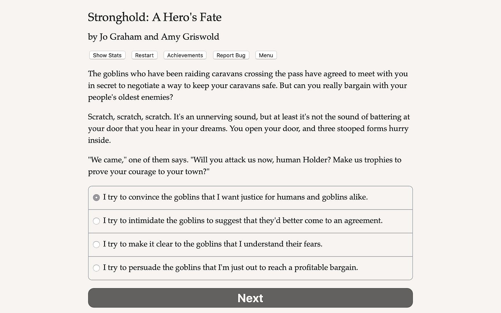 Stronghold: A Hero’s Fate is a 250,000-word interactive fantasy novel by Amy Griswold and Jo Graham, where your choices control the story. It's entirely text-based—without graphics or sound effects—and fueled by the vast, unstoppable power of your imagination.