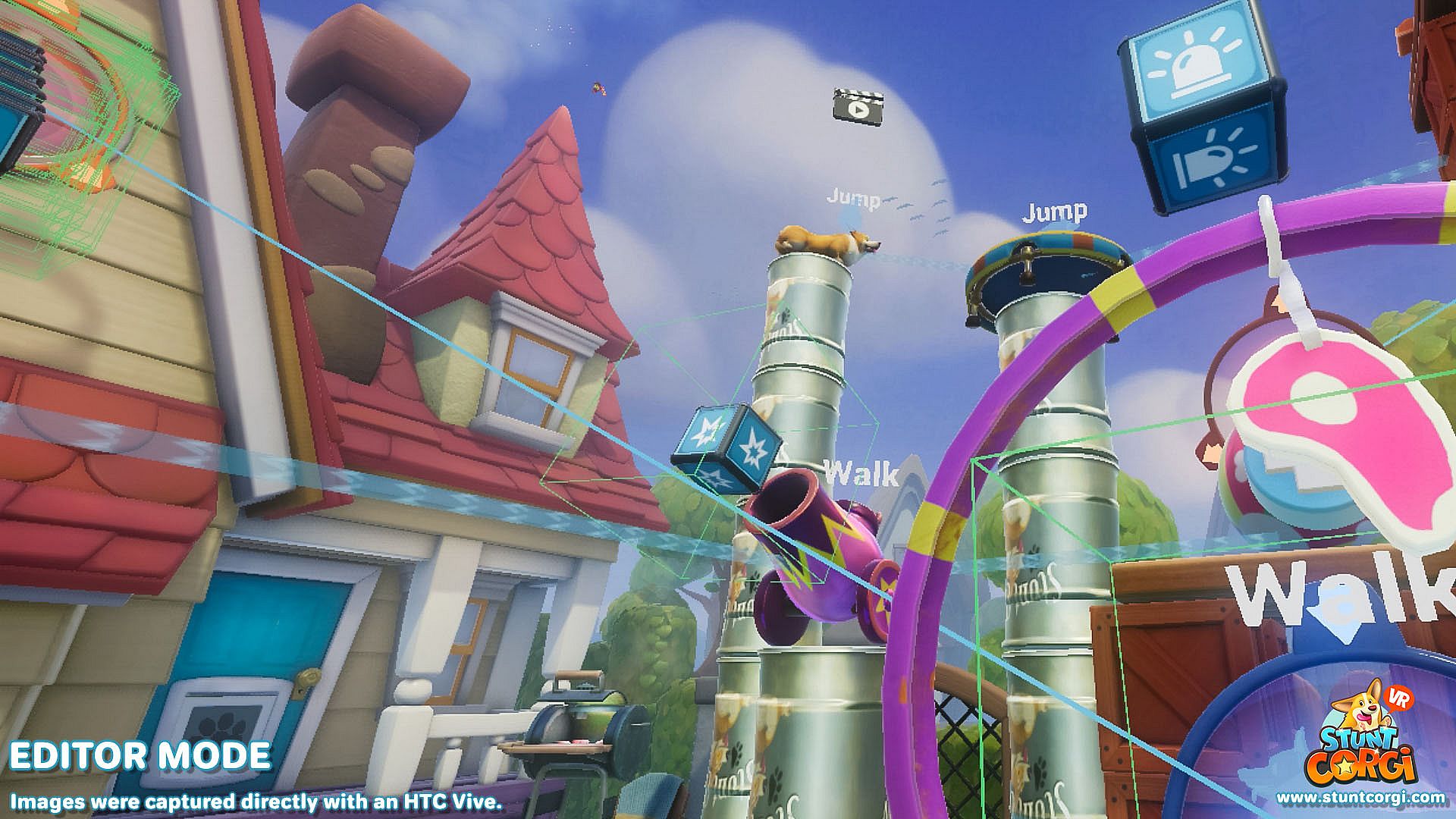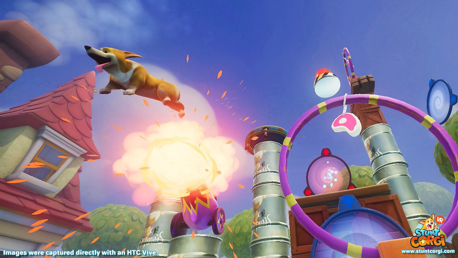 Train your corgi to become the world's top stunt pet in this VR simulation. Build custom courses with over 25 props and effects, from oil barrels and cannons to fire hoops and disco balls. Choreograph routines, dress your corgi in endless hat, collar, goggle, suit, shoe, and fur combinations, then yell "Action!" to watch the performance unfold.