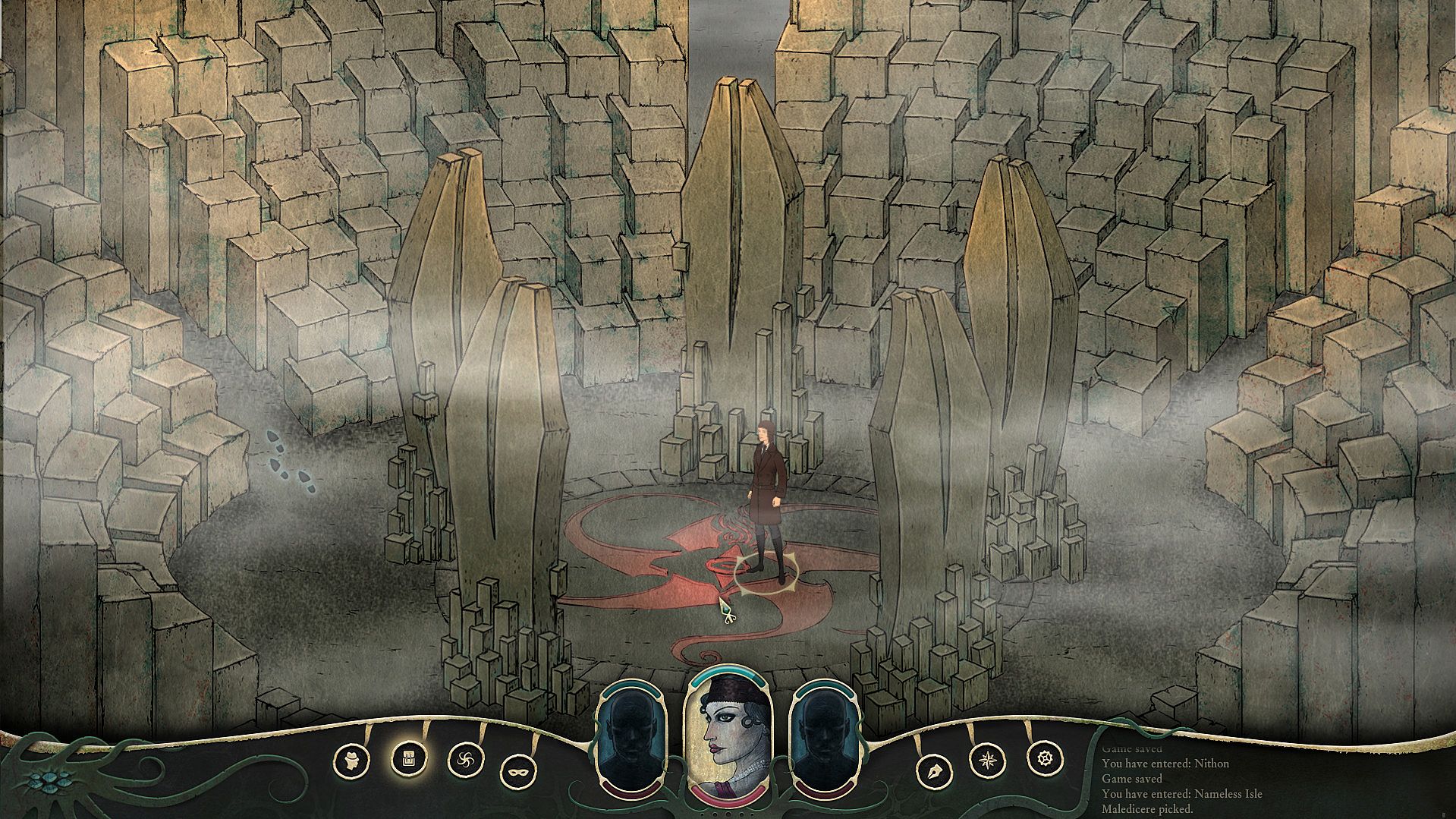 • A hand drawn 2D world reflecting Lovecraft's themes of cosmic horror and dread.