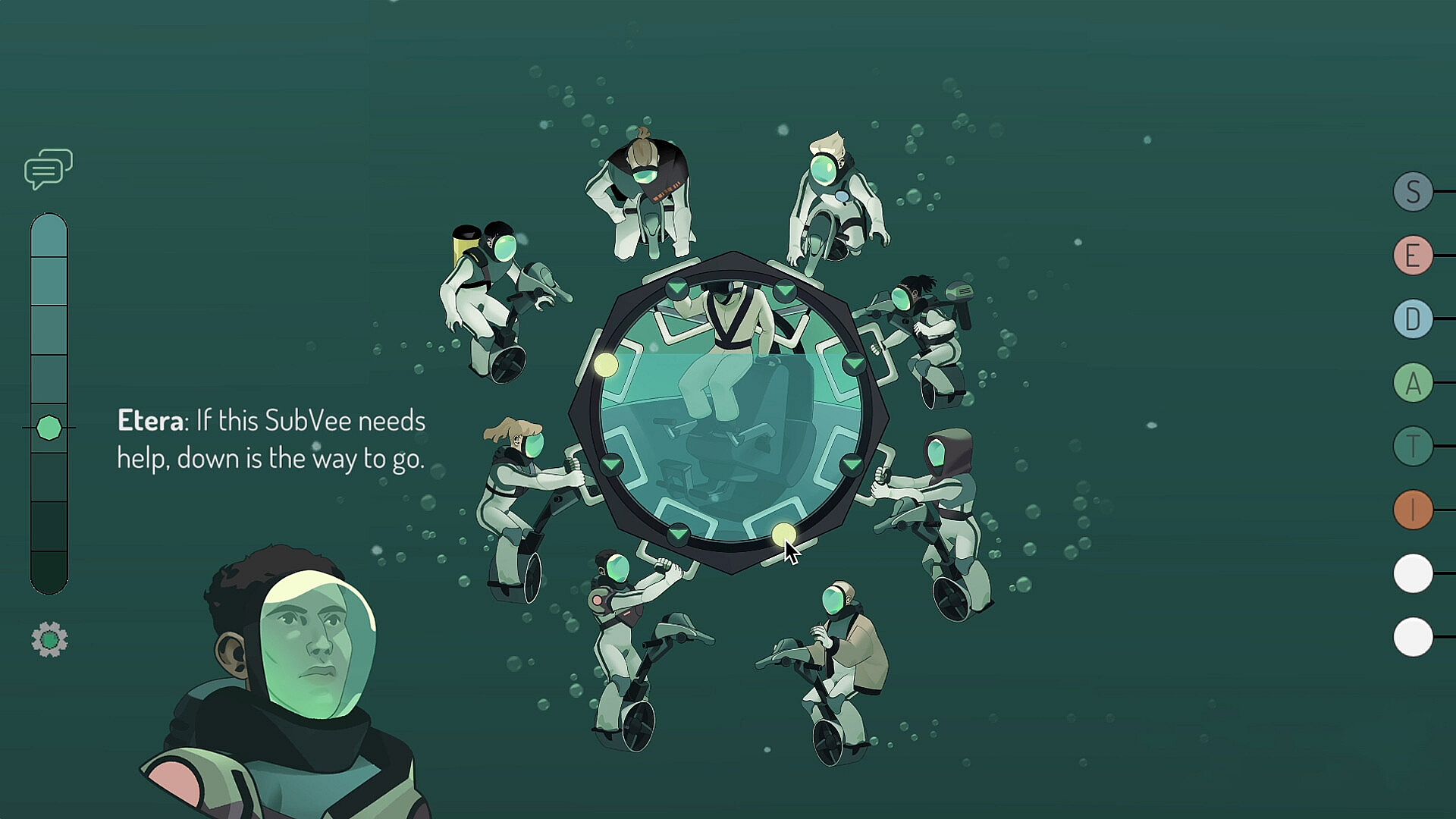 Your SubVee is a dilemma to the divers who find you. Follow hints from the surface to offer them the right handles at the right time. You need their agreement to move forward, but it won't come easily. Navigate a dark maze of emotional dynamics to find leverage to guide them toward consensus.