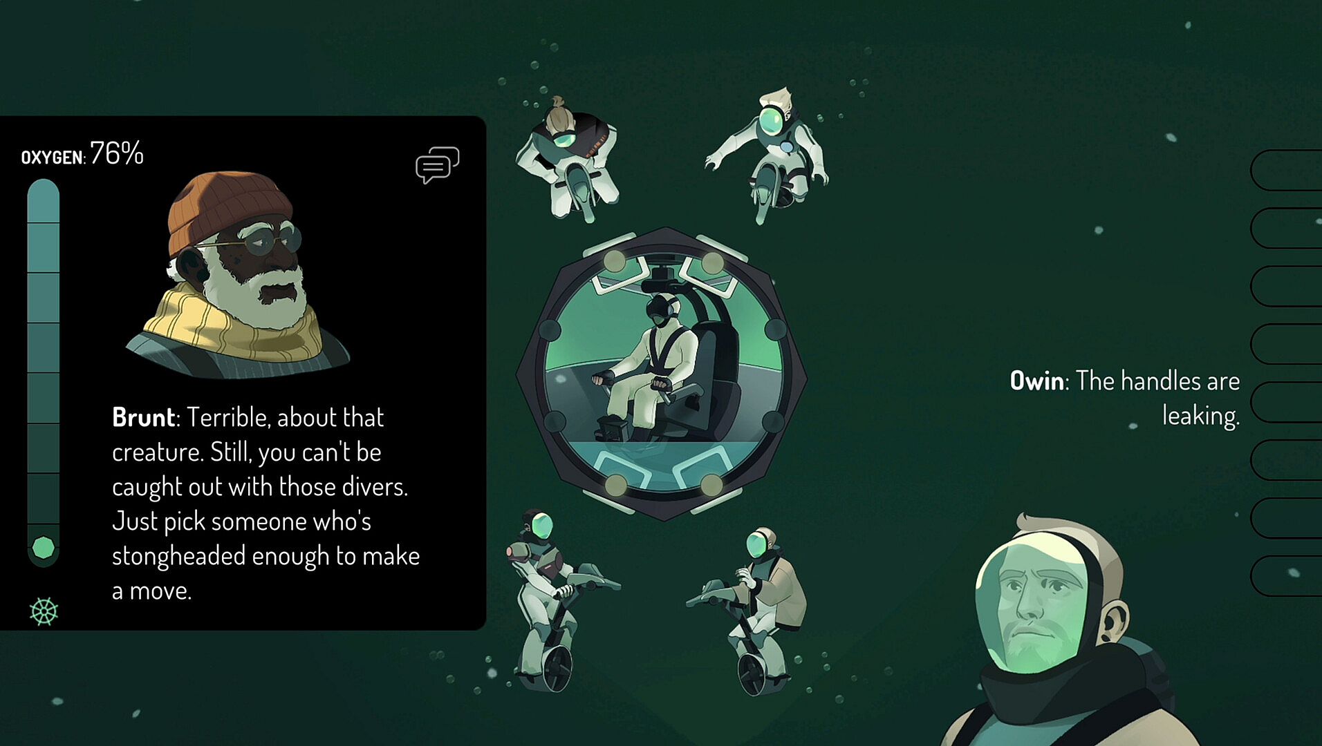 The ocean is heavy. From the eerie glow of your failing SubVee to the jittery reactions of the divers, every moment builds suspense.