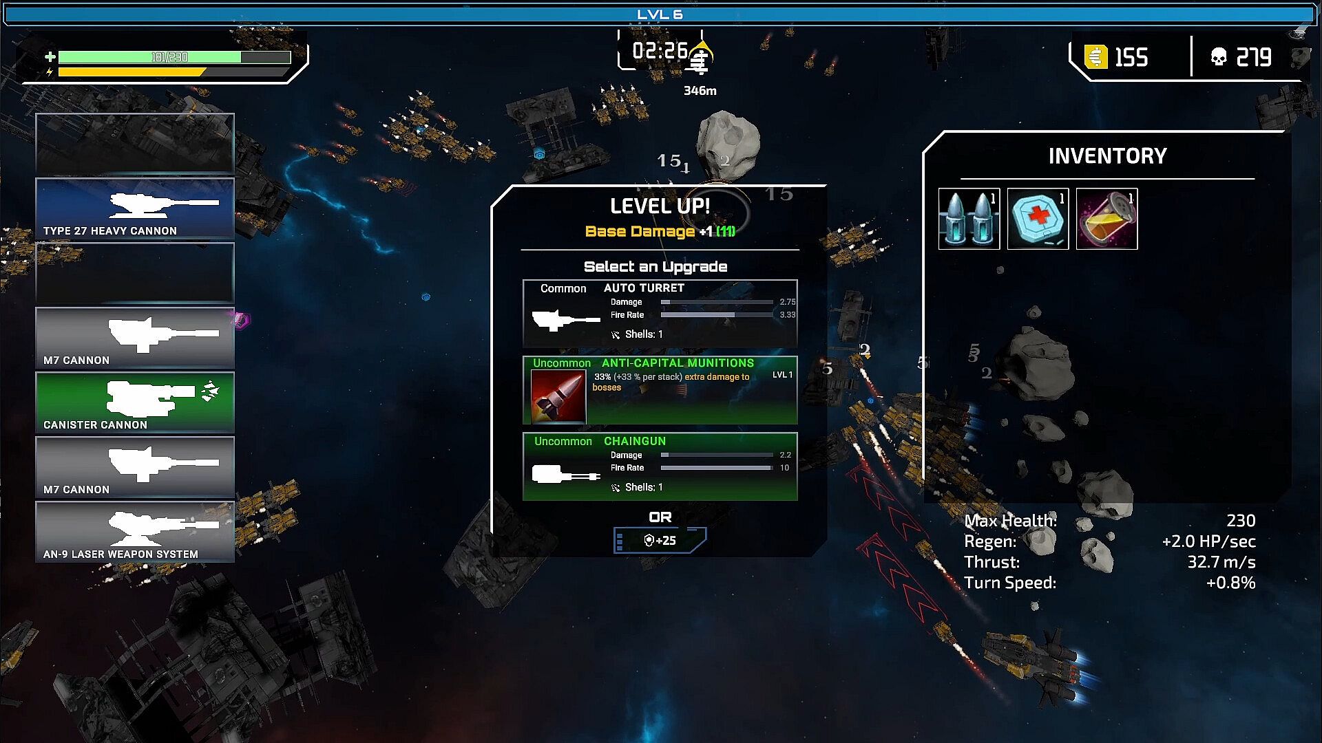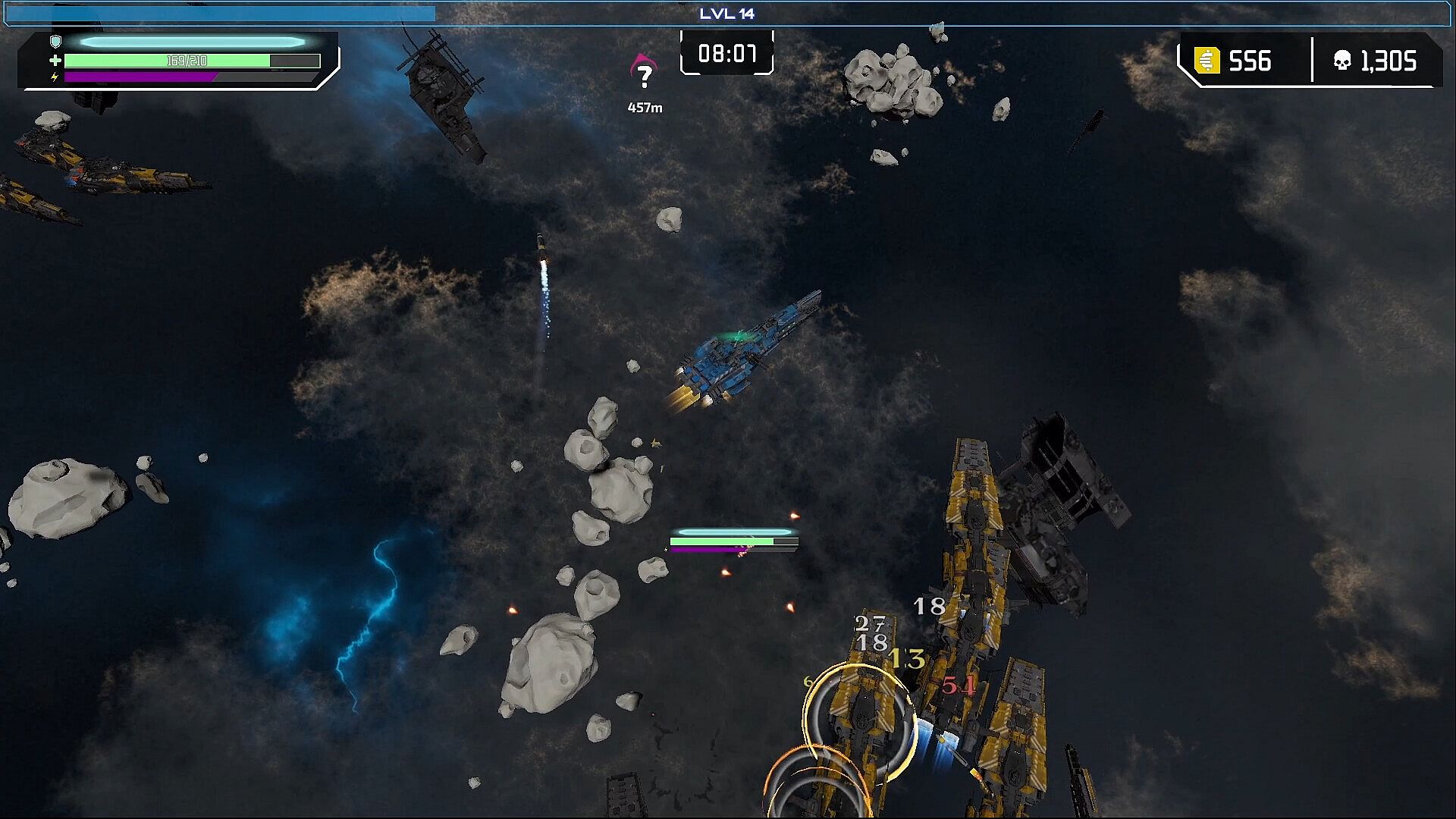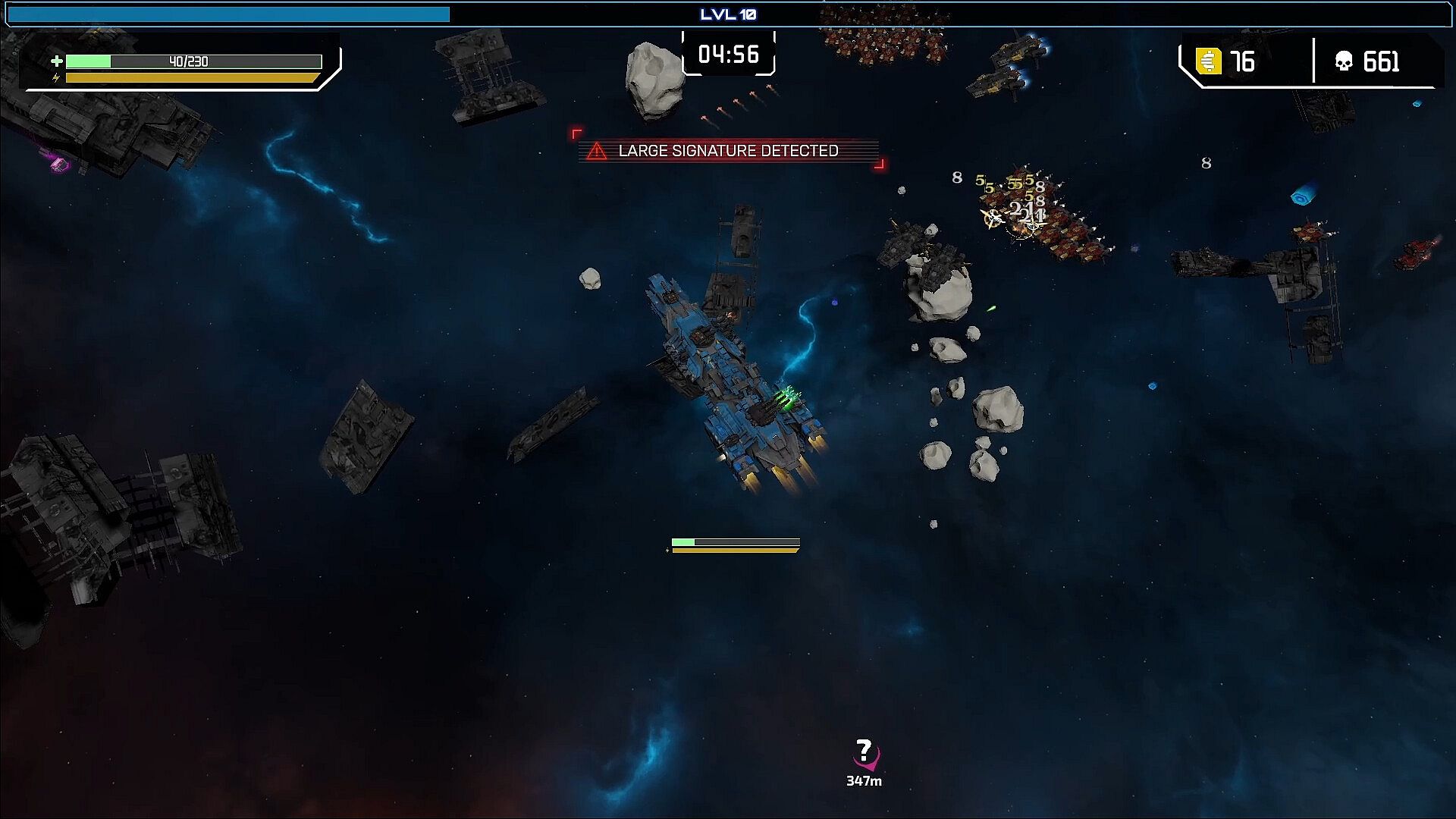 Blast enemies to salvage materials and level up your ship.