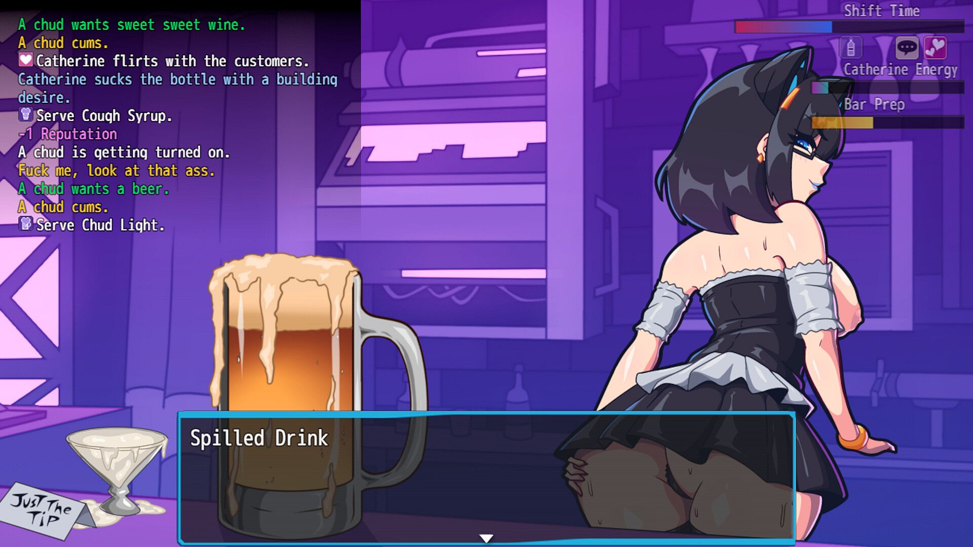 Every day Catherine works a shift at the bar serving drinks. Filling drinks just right grows the bar’s reputation. She can make shifts last longer and keep the customers around by making small talk, flirting, and more. The more aroused the customers get the more IO learns about human desires.