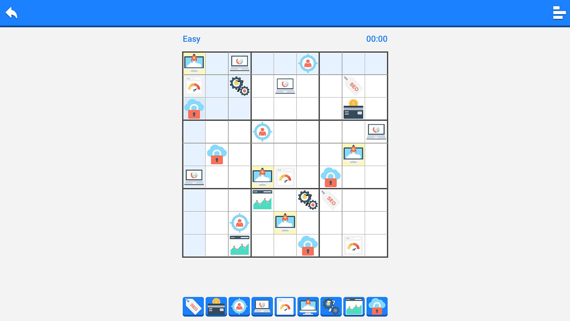 This is a variant of a very classic Sudoku game. You need to fill all the squares, ensuring that the icons in the same row, column and block are all different.
