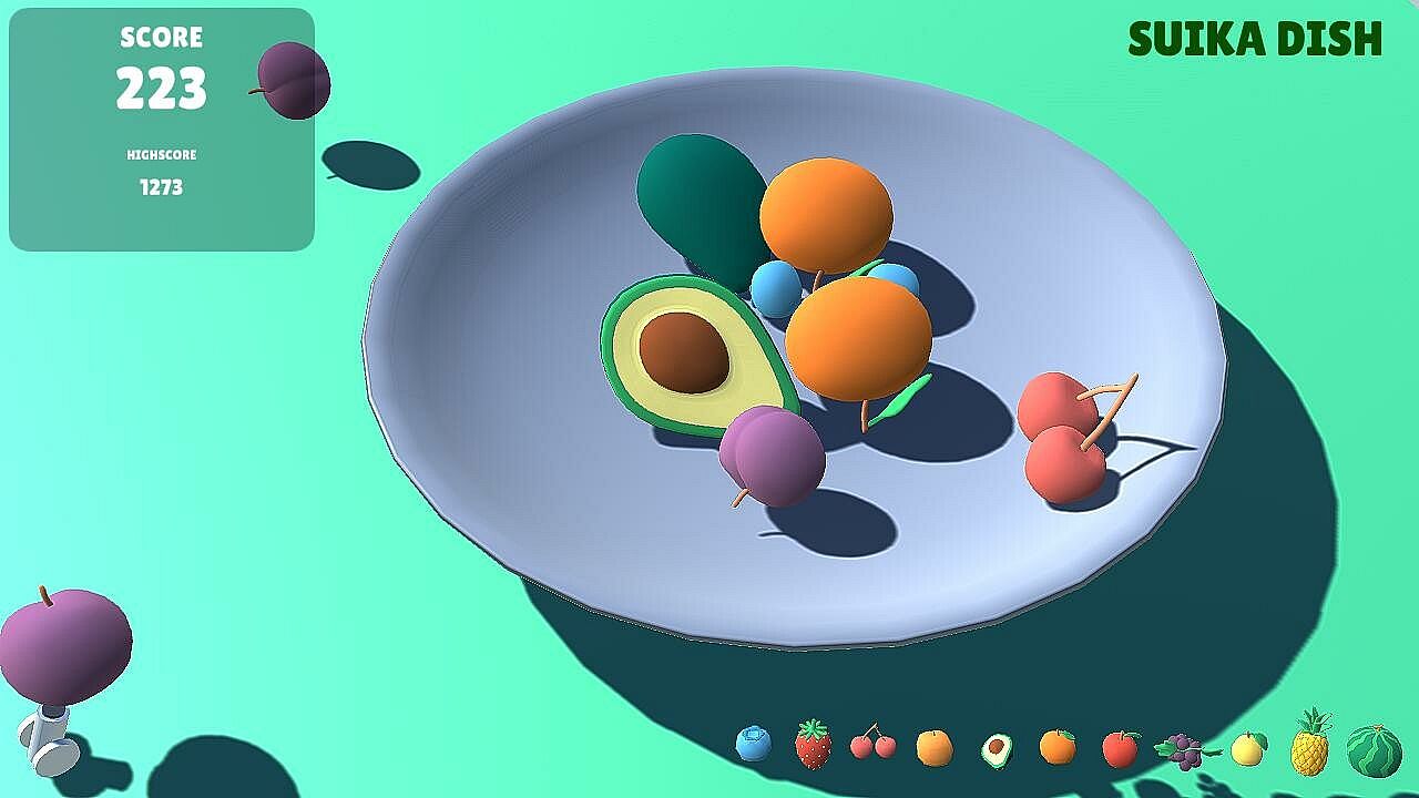 On the plate, collisions are calculated using 3D physics simulation. Fruits roll based on physical calculations, and when two fruits of the same type touch each other, the fruit changes to a larger fruit based on the point of contact. Repeat this process to make the fruit bigger, aiming to create the watermelon with the highest score.