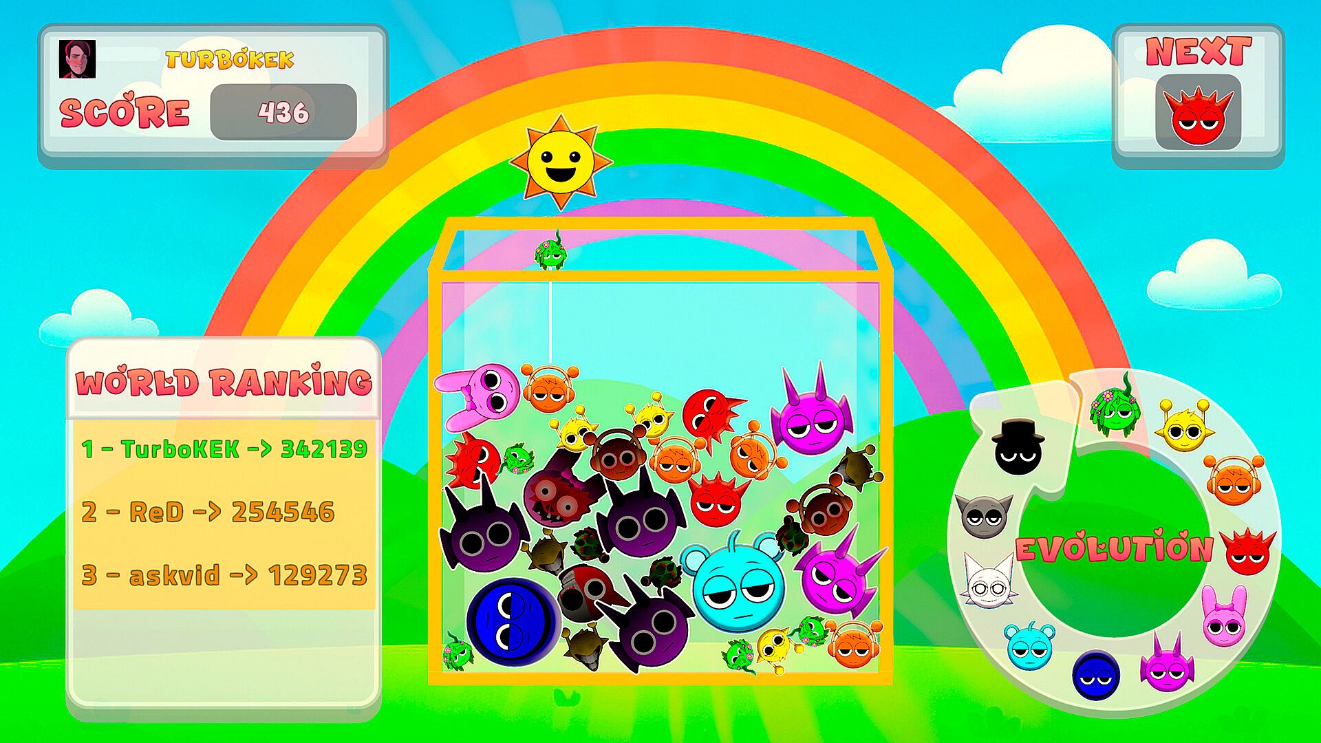 Suika Sprunki Edition is a vibrant arcade puzzle game inspired by the classic Suika formula, but with the unmistakable madness of the Sprunki universe. Drop character heads into a container and watch them bounce, collide, and merge into strange, evolving forms. What starts as a simple mechanic quickly becomes a thrilling challenge of timing, precision, and strategy. Don’t let the box overflow—score high and unlock even weirder evolutions.