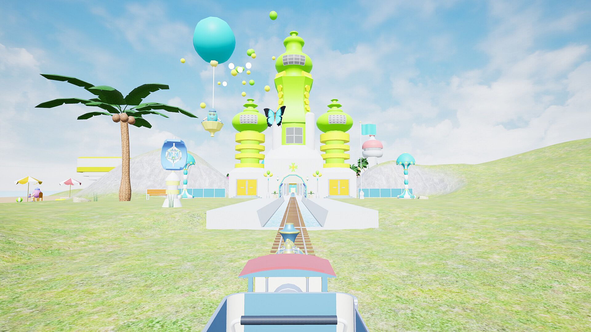 Take an almost 15 min. train coaster ride through a colorful island called Sunny Shores, home of the Bubblers character. See the homes that blow bubbles, watch the Bubblers fly in their balloons, aircraft and rocket surfboards. Go through 4 rooms with large bouncing balls hitting geometric sculptures. Watch the Bubblers go through their own rides throughout the island and see where they live. Catch a 75 ft gliding wave with them. Plunge down a 1,000 ft drop when the train attaches itself to wings and soar through an obstacle course of fun.