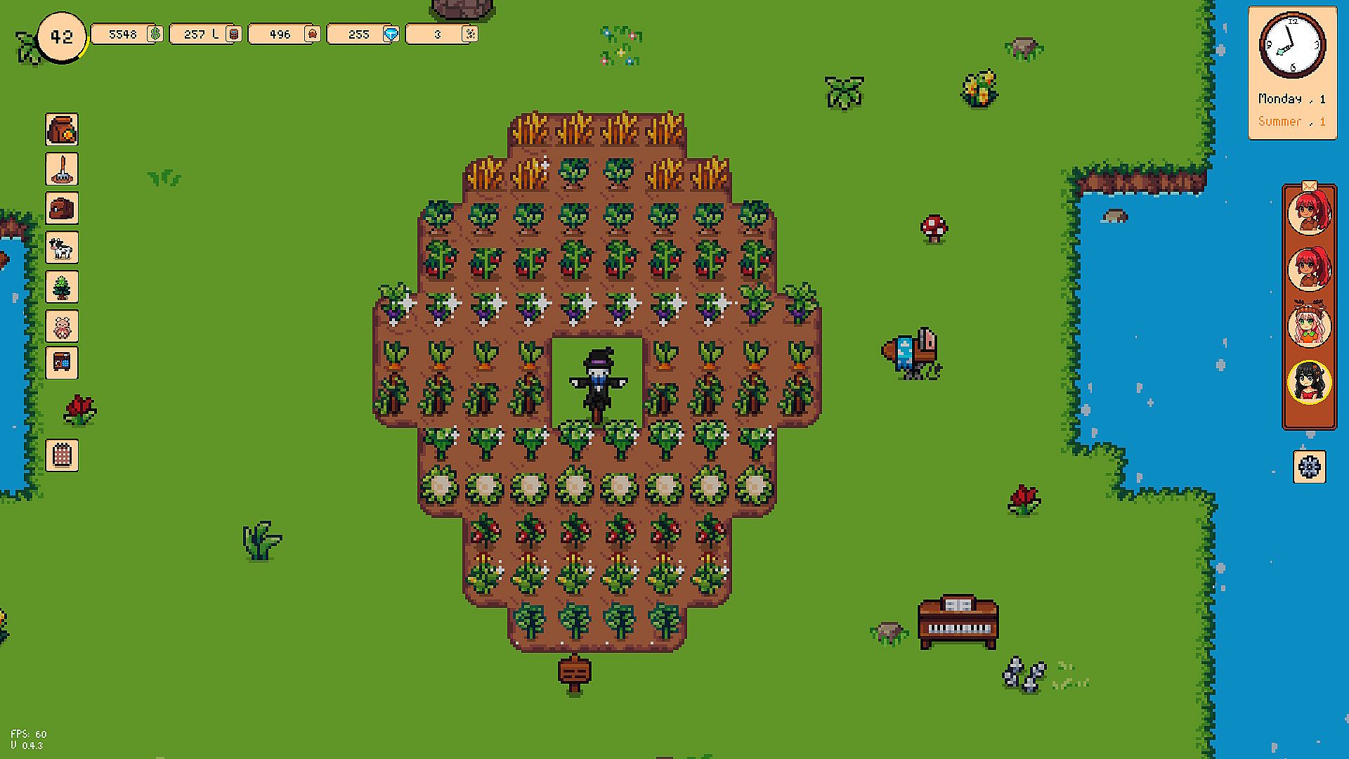 A cozy relaxing farming sim with a cute simplistic art style with vibrant colors, characters, and classic gameplay.