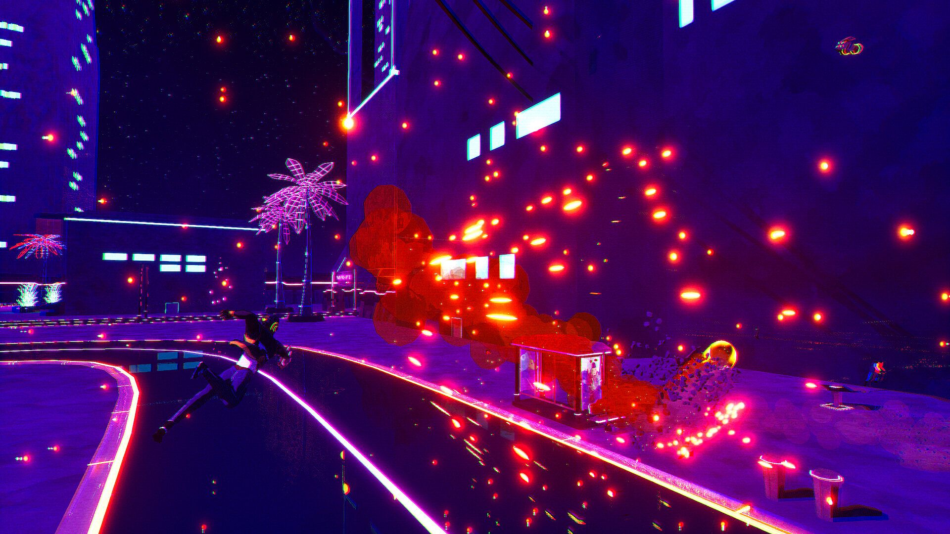 Explore stylized, vibrant regions and city districts. Discover new shortcuts and create new routes, alternating between K8E's gauntlet and bike form to chain together movement abilities.