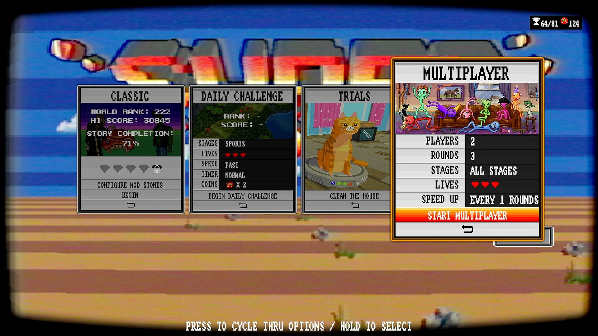 There's currently 81 achievements in SUPER 56, and some are easier to unlock than others! Use CAREER MODE to practice the stages and unlock achievements. There's always room for more achievements as we add new features.