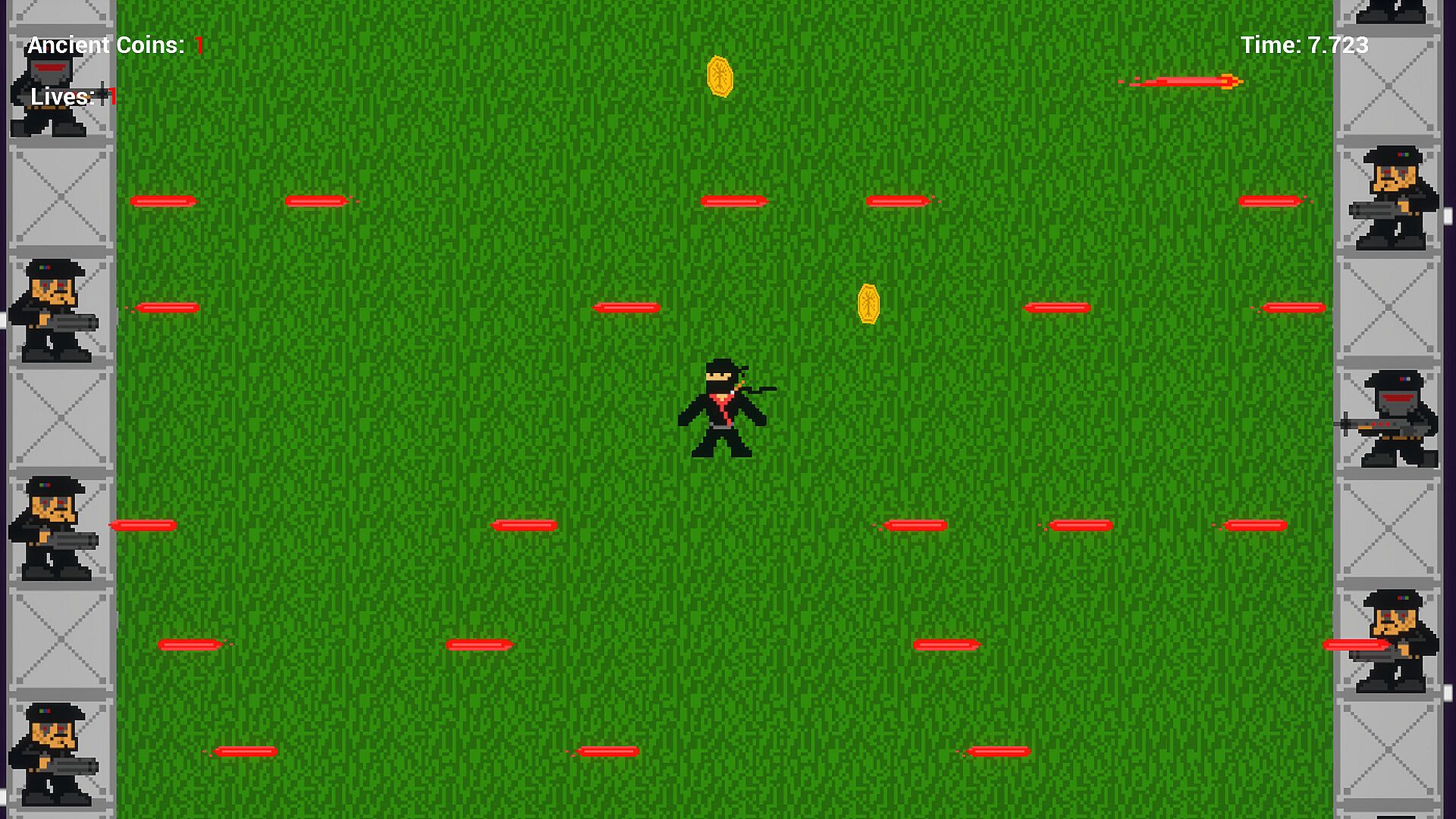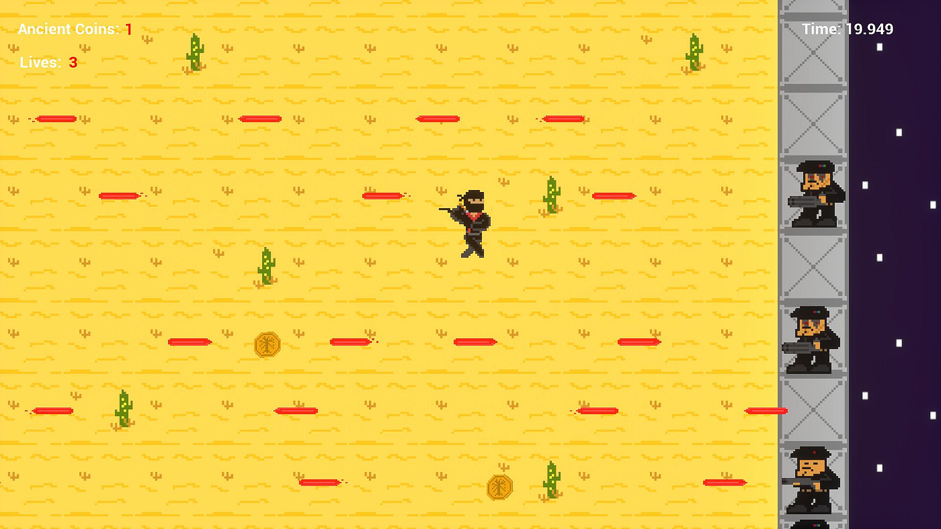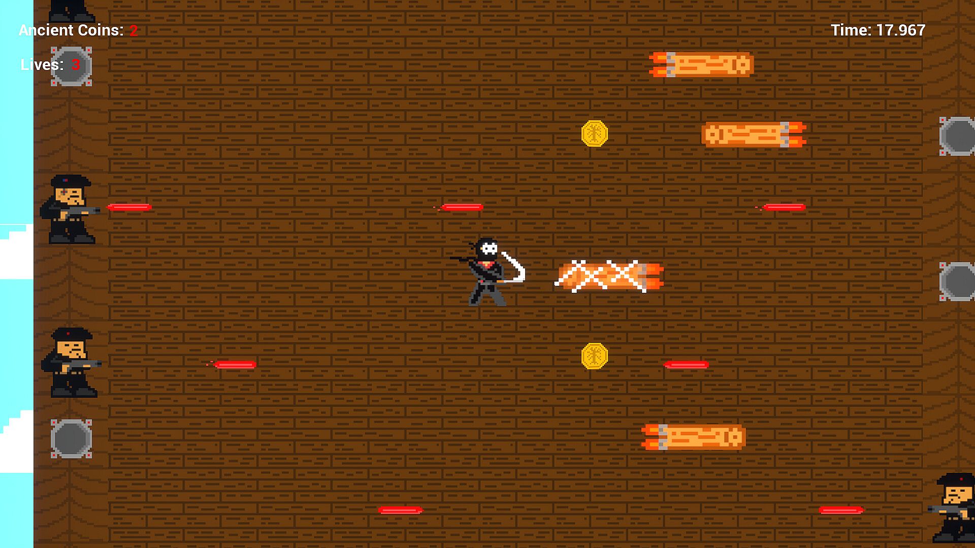 An Army of mercenaries with advanced weaponry is marching across the globe! You must find the one responsible and stop them! You must dodge, and cut!, hazards as you advance through various terrain. Cross the platforms over pitfalls and collect coins as you move through the level!