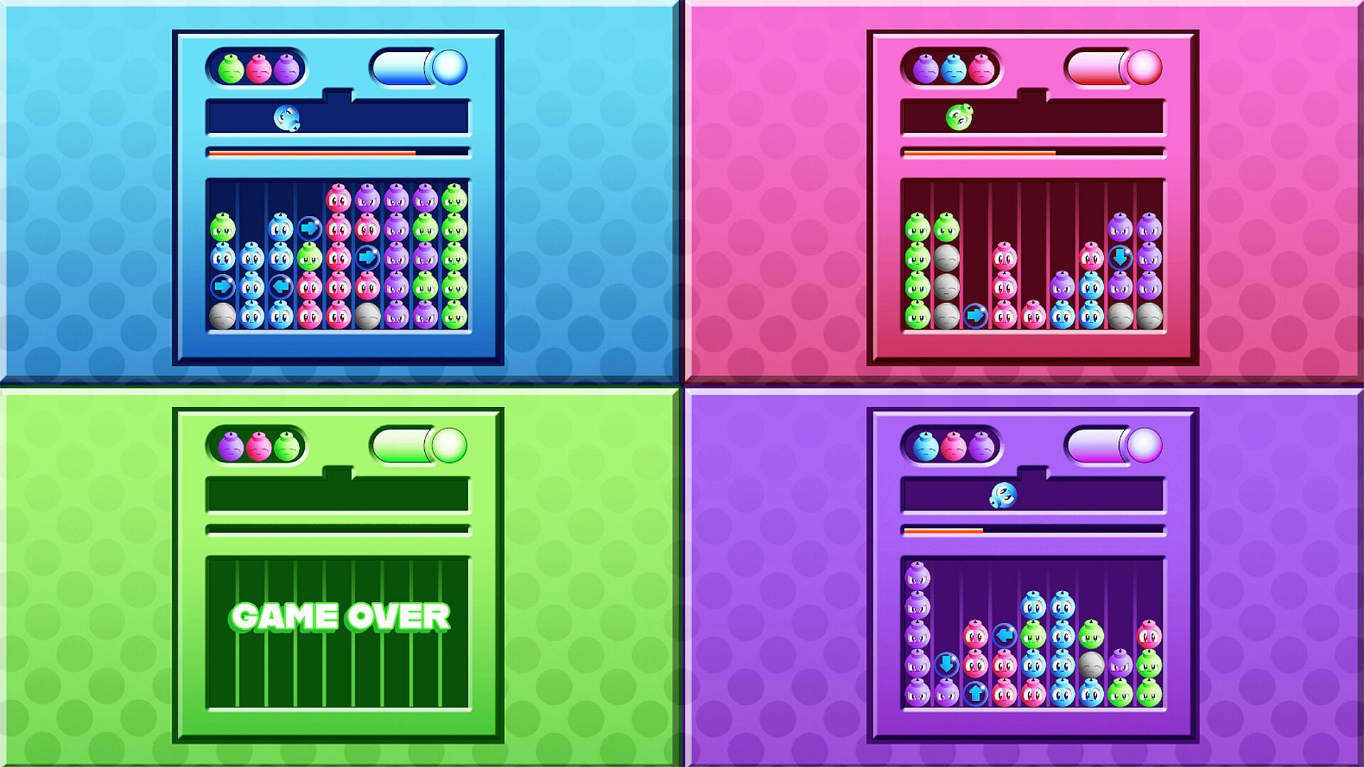 Super Puzzle Bomber is a vibrant reimagining of classic arcade-style puzzle action, blending fast-paced strategy with explosive fun. Roll and drop colorful bombs onto the playfield, carefully stacking and positioning them to set up chain reactions, then detonate them once your meter is full to trigger massive combos.