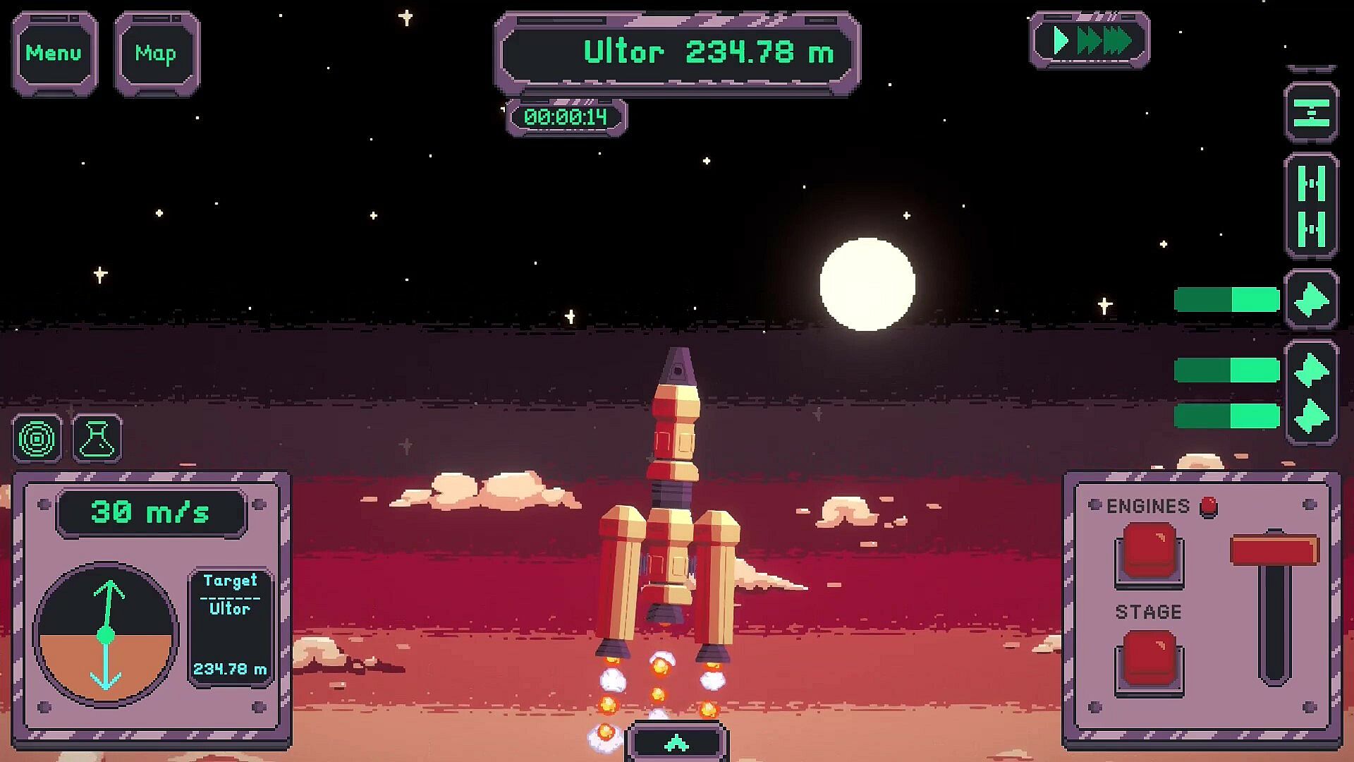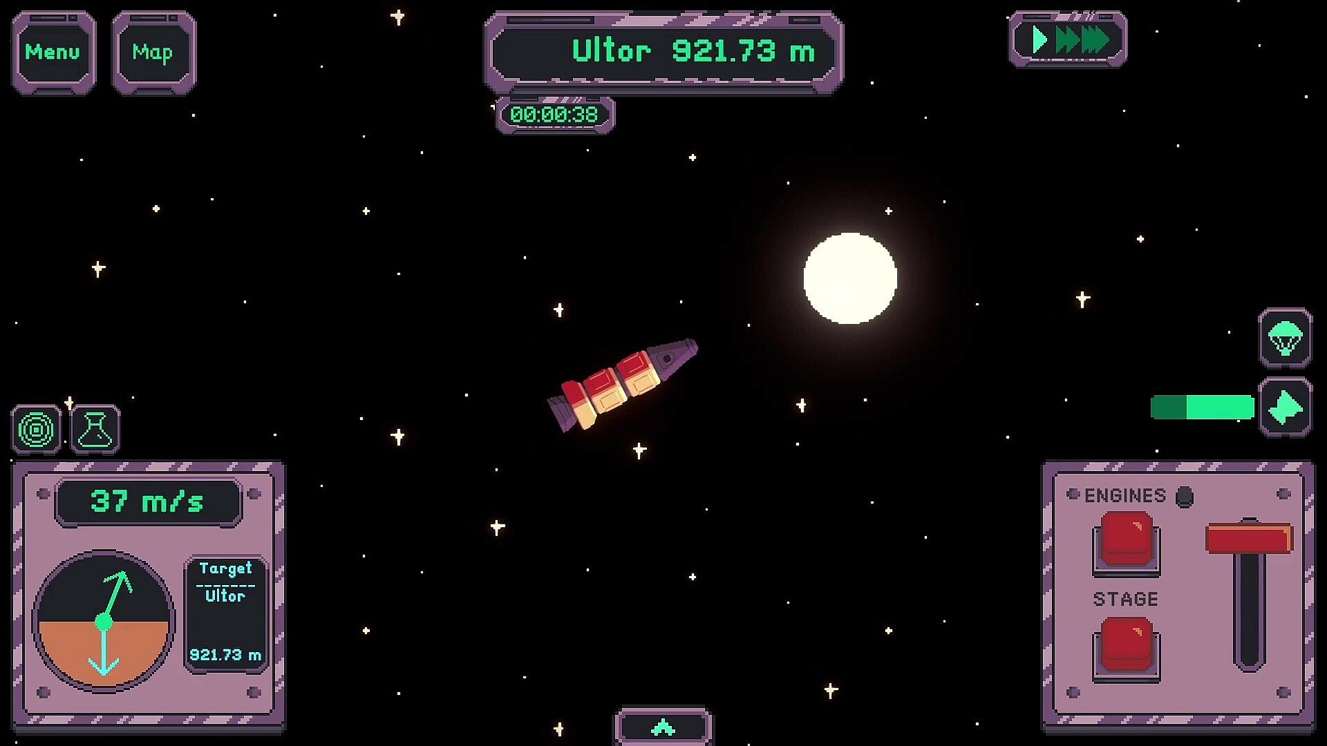 The 2D physics system provides a challenging and immersive rocket flight experience. Build strong and stable ships, keep your velocity in check, and try not to break off any of your ship components along the way (They're really expensive).