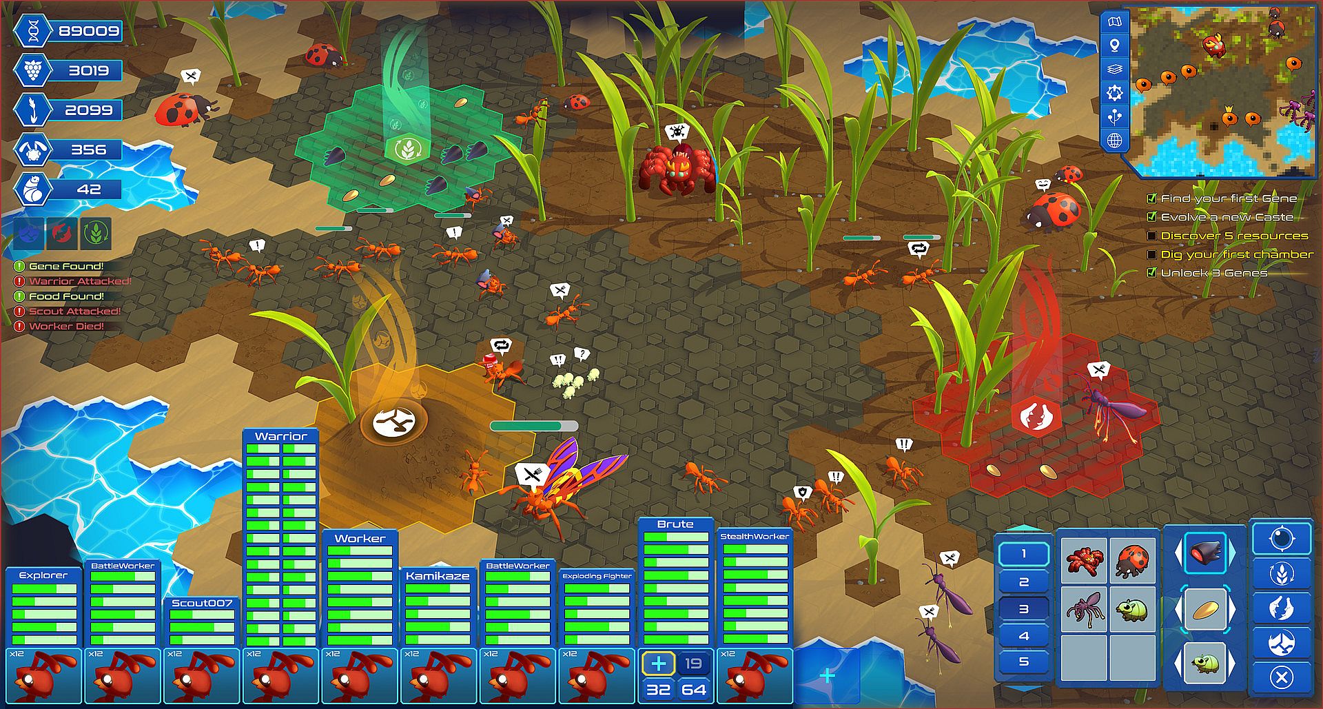 Collect DNA points from the environment to unlock genes and evolve your ants into specialized castes. Experiment with unique abilities like flying, web-slinging, and explosions.