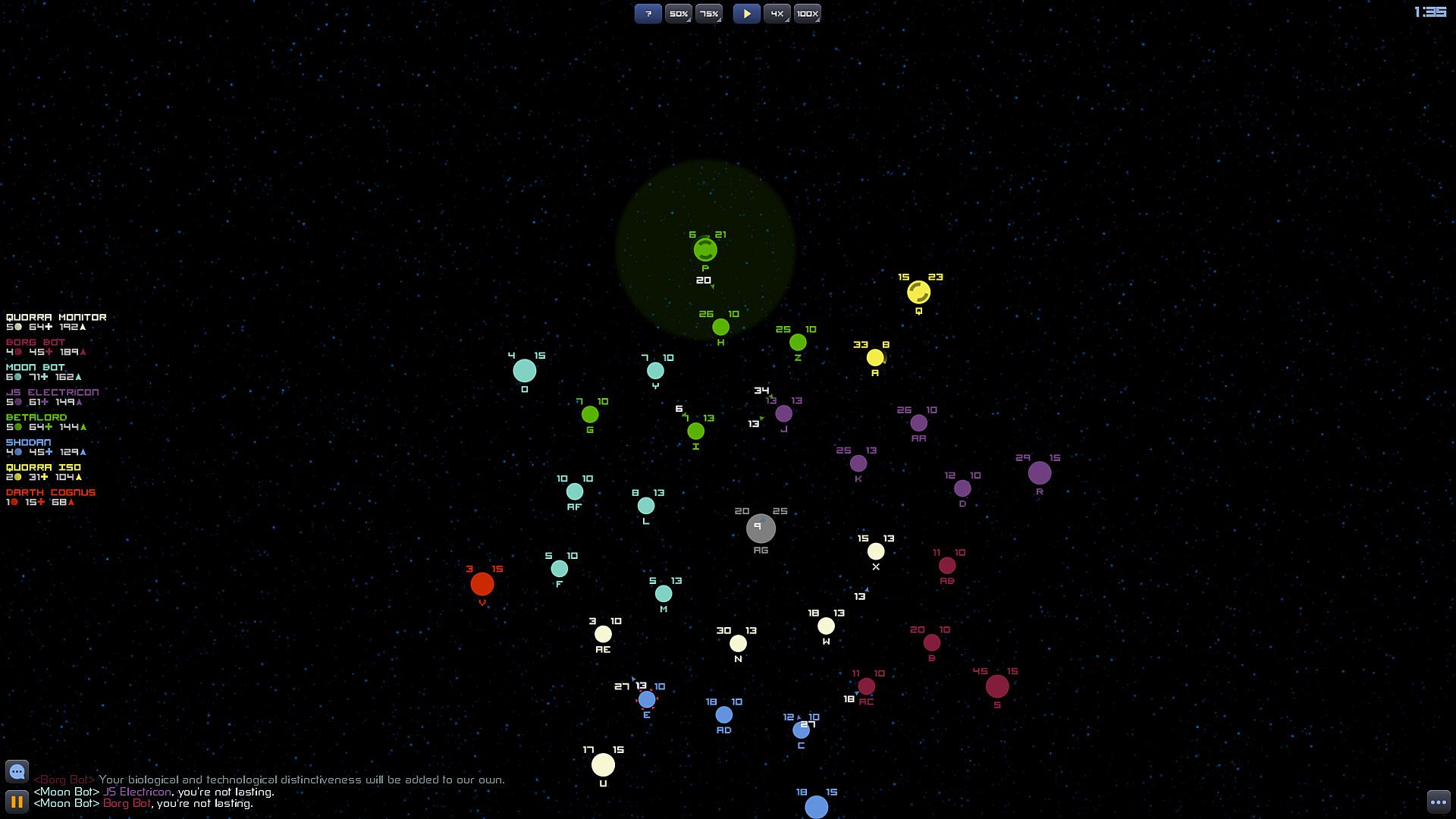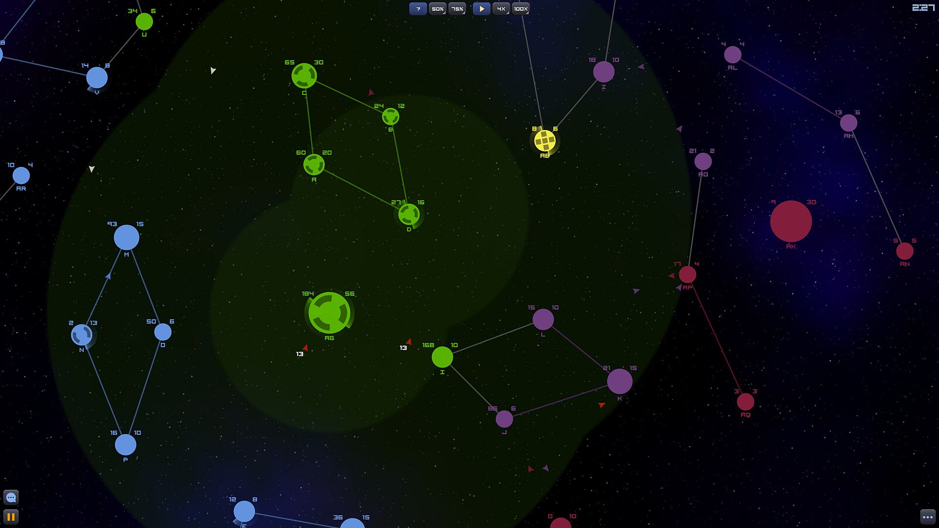 Aim of the game is to conquer all enemy planets on the map. Each planet has its own production value, which dictates the speed of ship production. You can send ships off of your planet to any other planet - if target planet is enemy, a battle will commence once ships arrive at the planet. In case of your own planets or that of allies, those planets get reinforced by the ships you send to them.
