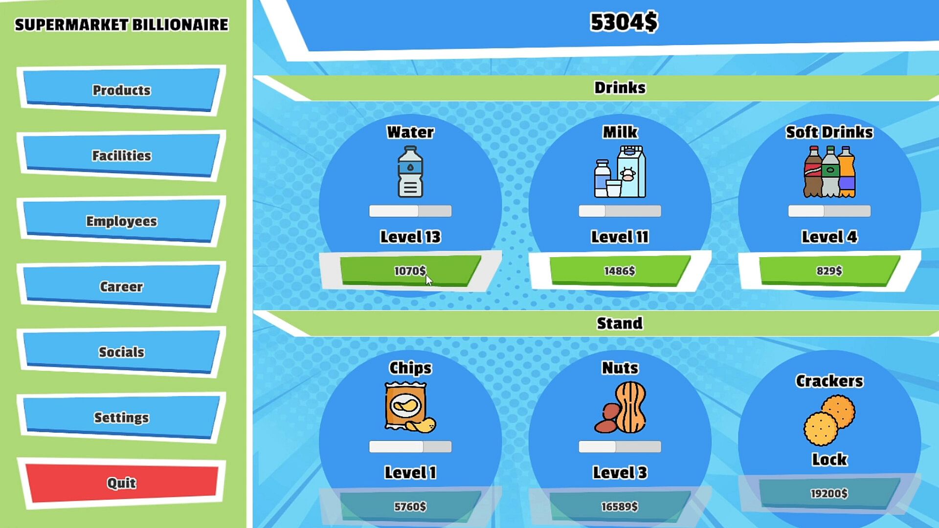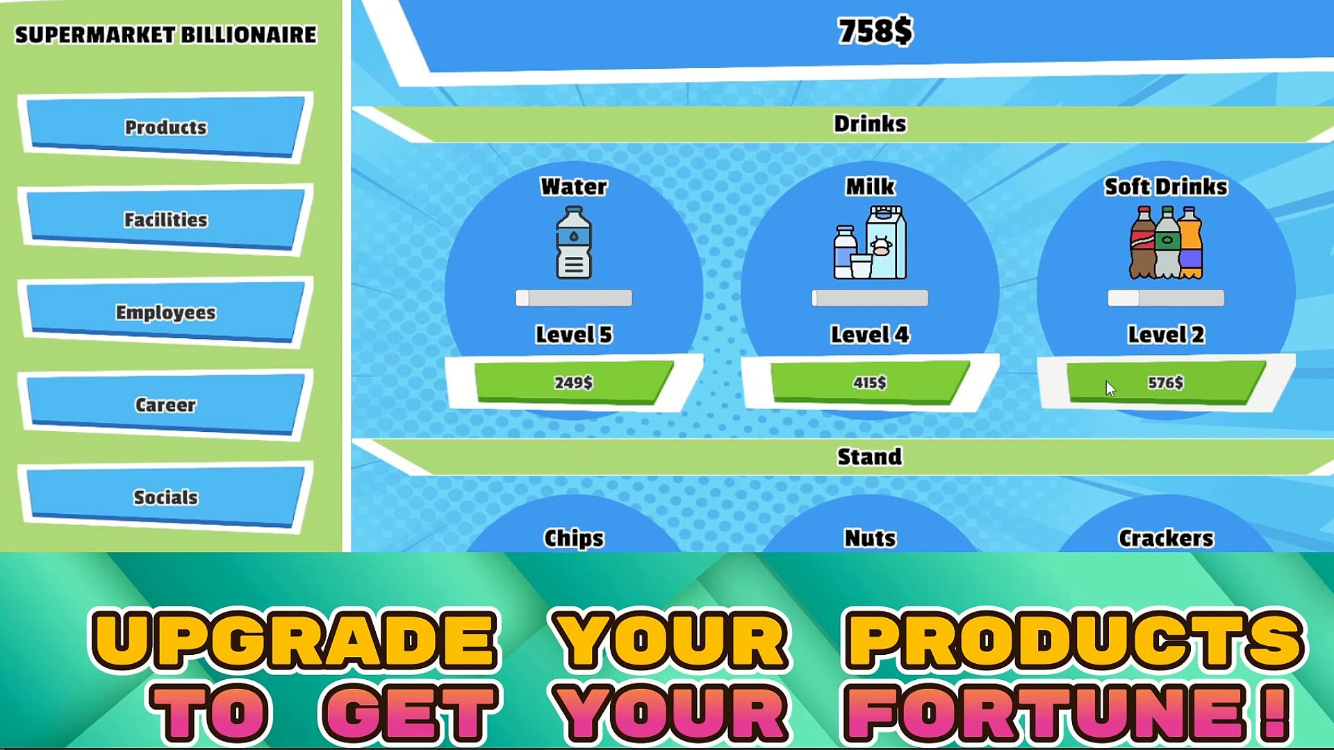 Unlock and upgrade your supermarket products to generate amazing passive income nonstop! The better your products, the more you earn...