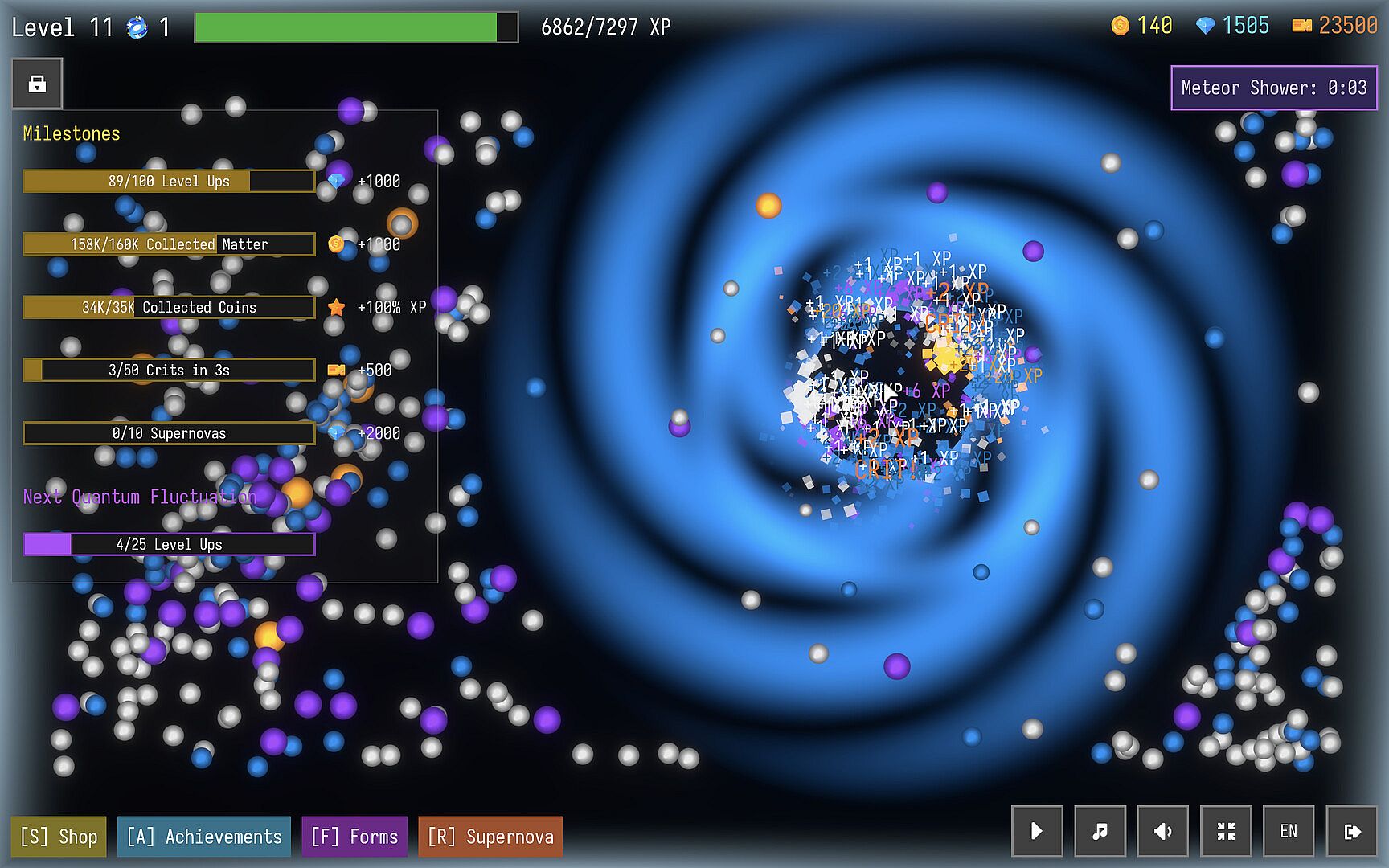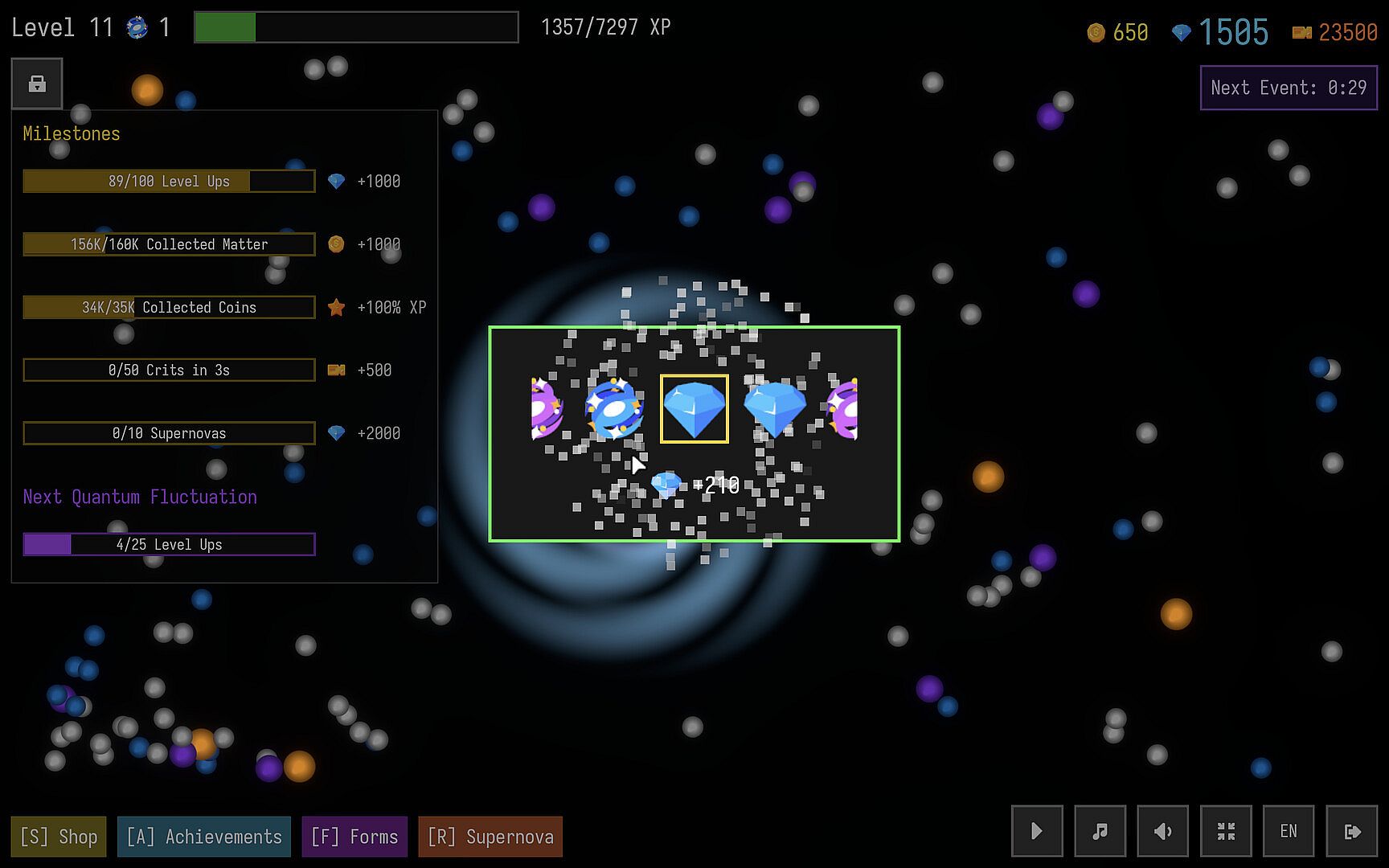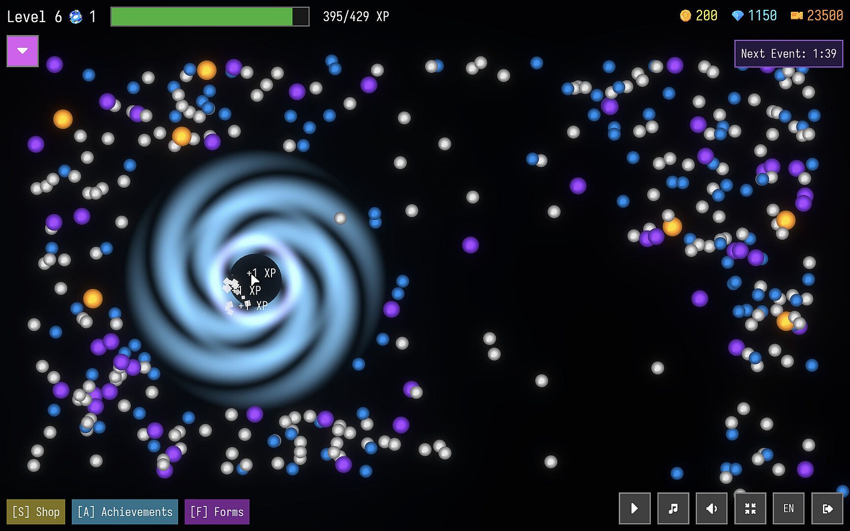 Unlock Cosmic Events that can trigger at random, granting additional resources, massively increasing matter spawns, or instantly absorbing all matter on screen.