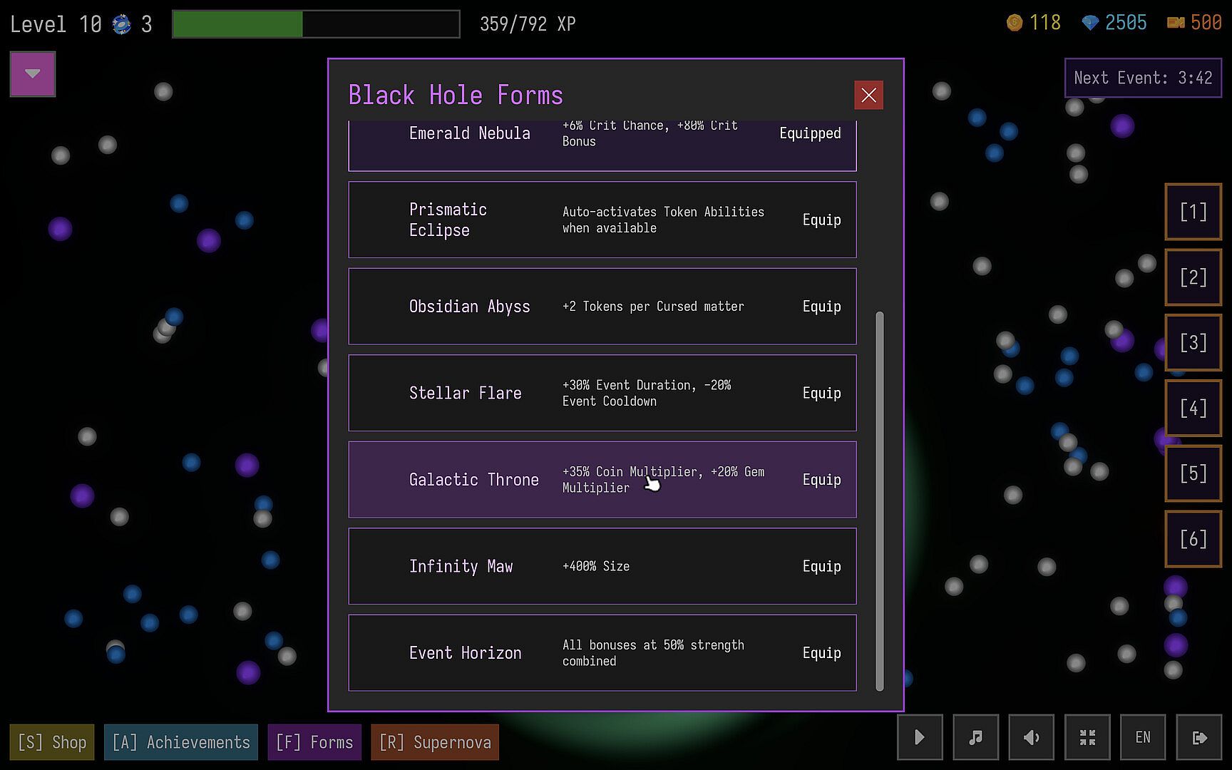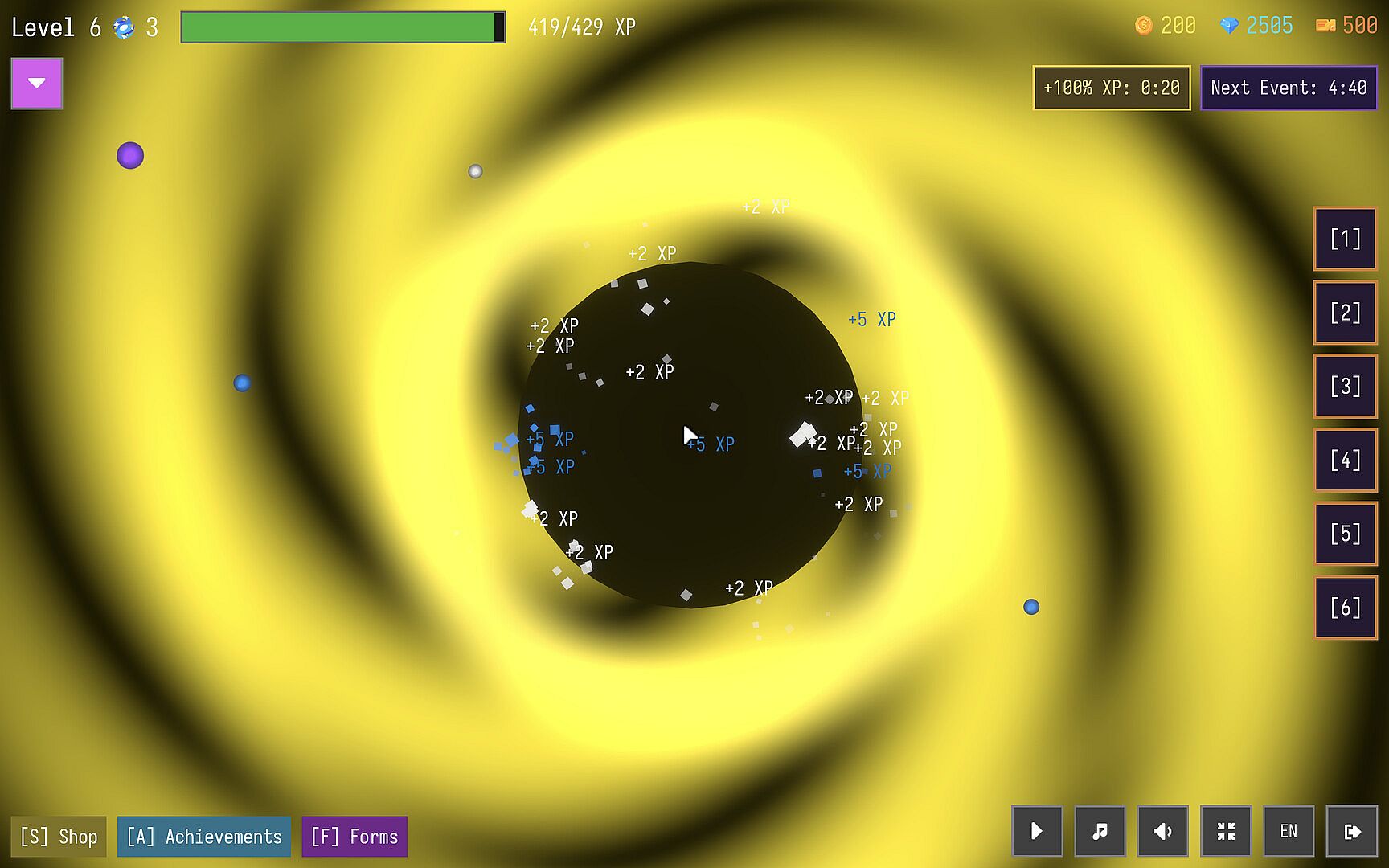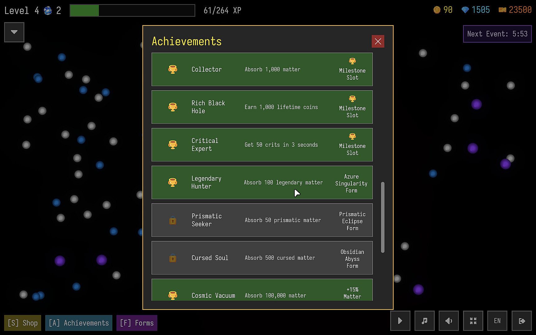 Unlock Cosmic Events that can trigger at random, granting additional resources, massively increasing matter spawns, or instantly absorbing all matter on screen.