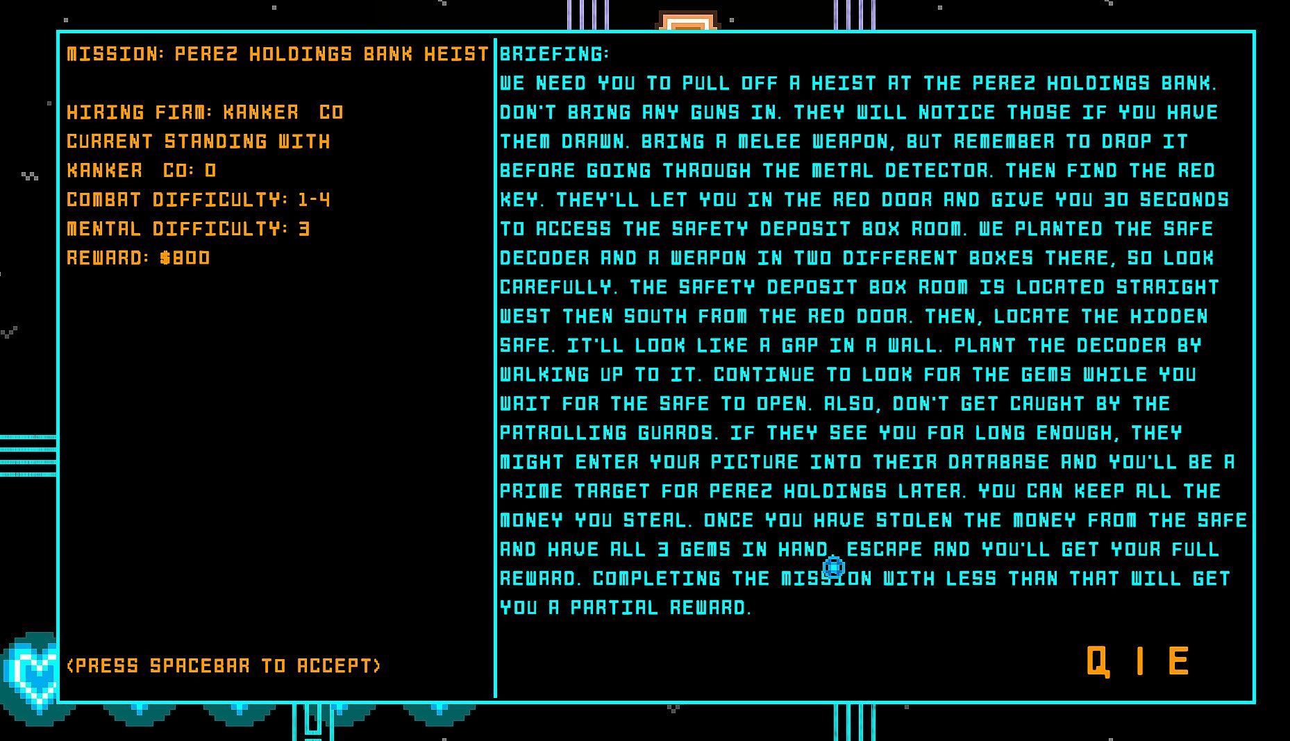 In this 2D, Top-Down Shooter, you take control of a mercenary named Suqare as he tries to make a name for himself. You will take jobs from different corporations to build rapport with them and make money. Decisions made during missions determine what jobs you have access to, your reward, how each corporation fares compared to the others, and even the over-arching story. Use strategy and skill to outwit, outsmart and outshoot your enemies.