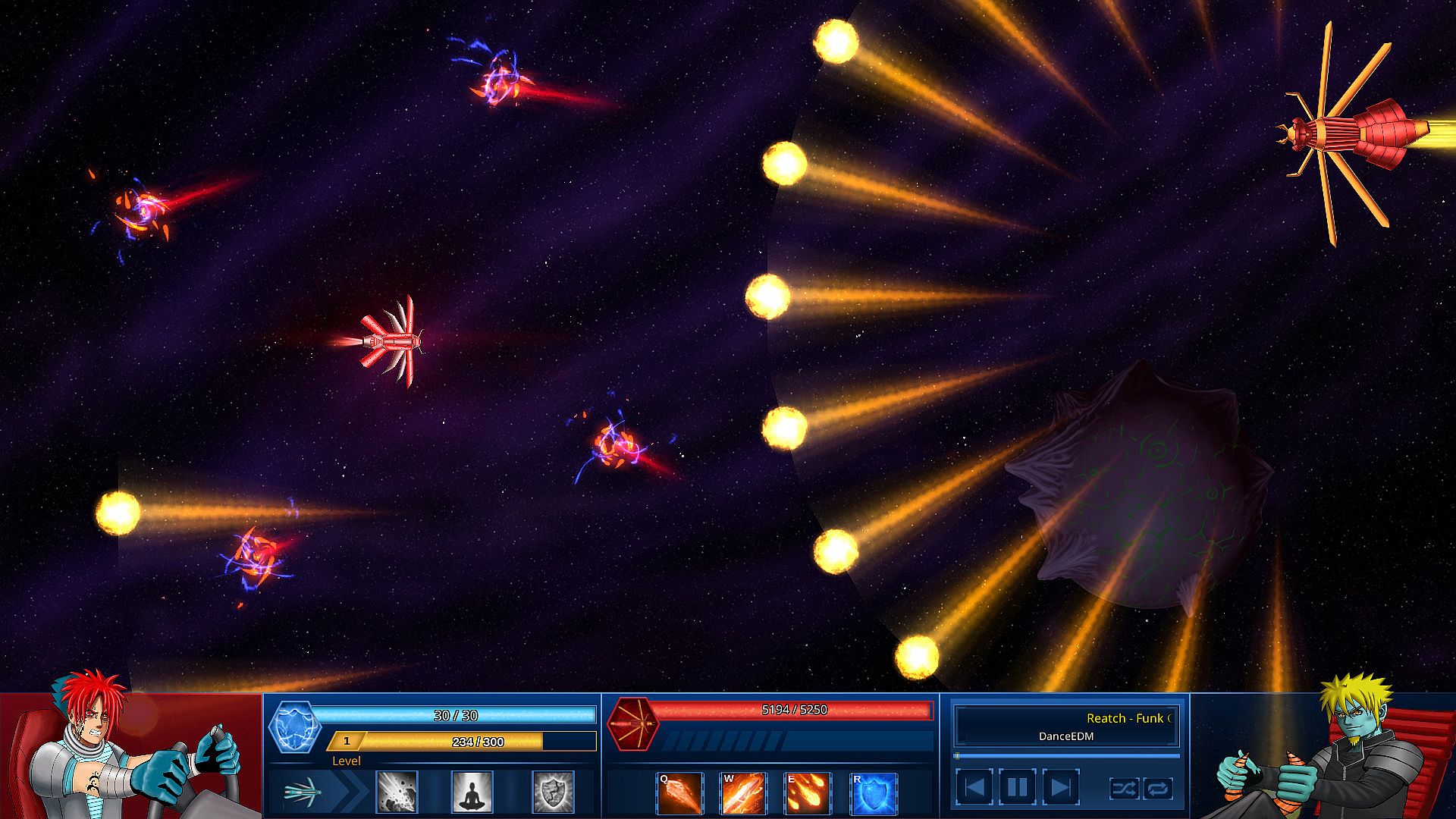 Survive in Space is a skill-based space shooter with a hardcore focus on gameplay mechanics. You take on the role of Sasaki, a young soldier who discovers the horrible truth of humanity’s enslavement at the hands of the alien Chronicles during a routine mission. His deep anguish leads him to spiral into depression, and in the darkest depths he finds The Shadow, a primal being full of hate that grants him the power to confront the Chronicles.