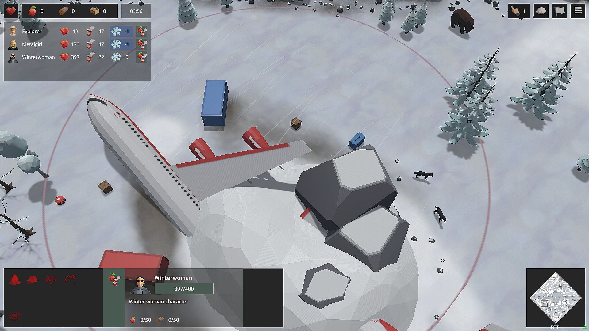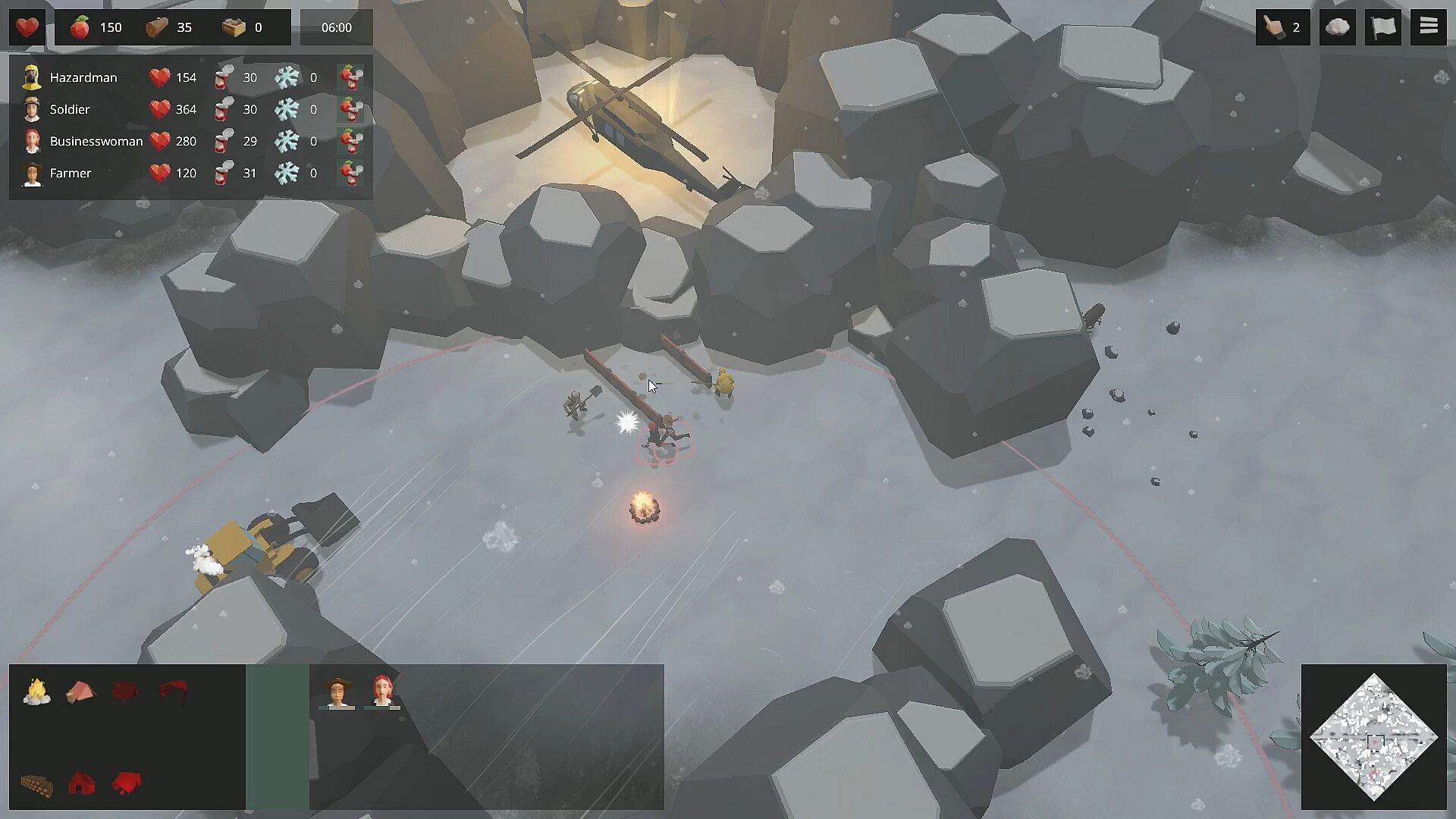 At its core, the gameplay revolves around managing four distinct survivors, each with unique stats, abilities, and weapons. You direct them in a top-down view to gather resources, construct buildings, and fend off environmental hazards like wild animals and shifting weather conditions. Cold and hunger mechanics demand constant attention, as failing to maintain these can lead to character loss. Building a tunnel to reach a central chopper serves as the main objective, requiring careful optimization of build orders and resource allocation. Multiplayer adds a layer of rivalry, where you can deploy threats such as blizzards or wolf packs to sabotage your opponent while advancing your own progress.