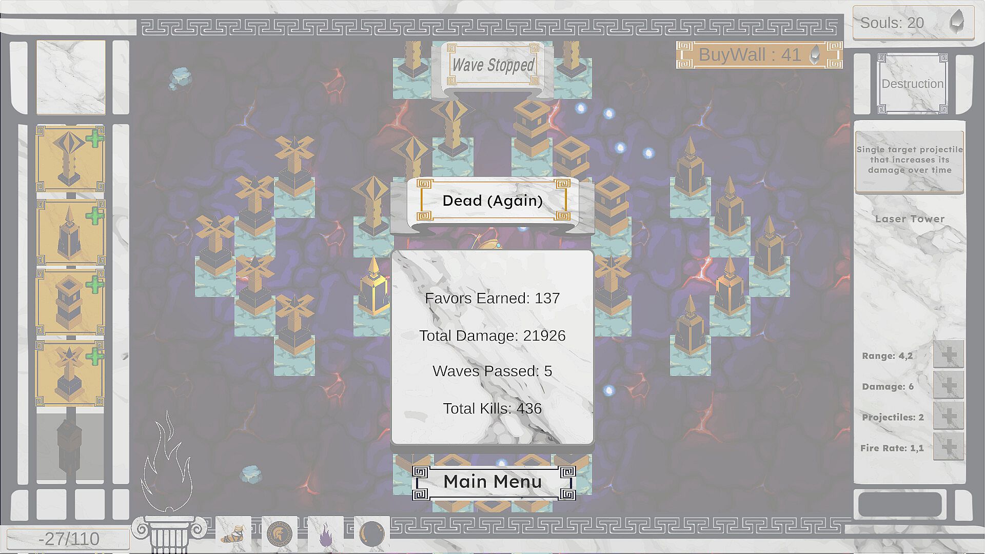 Collect divine favors, upgrade your defenses, and experiment with different builds to push further each time.