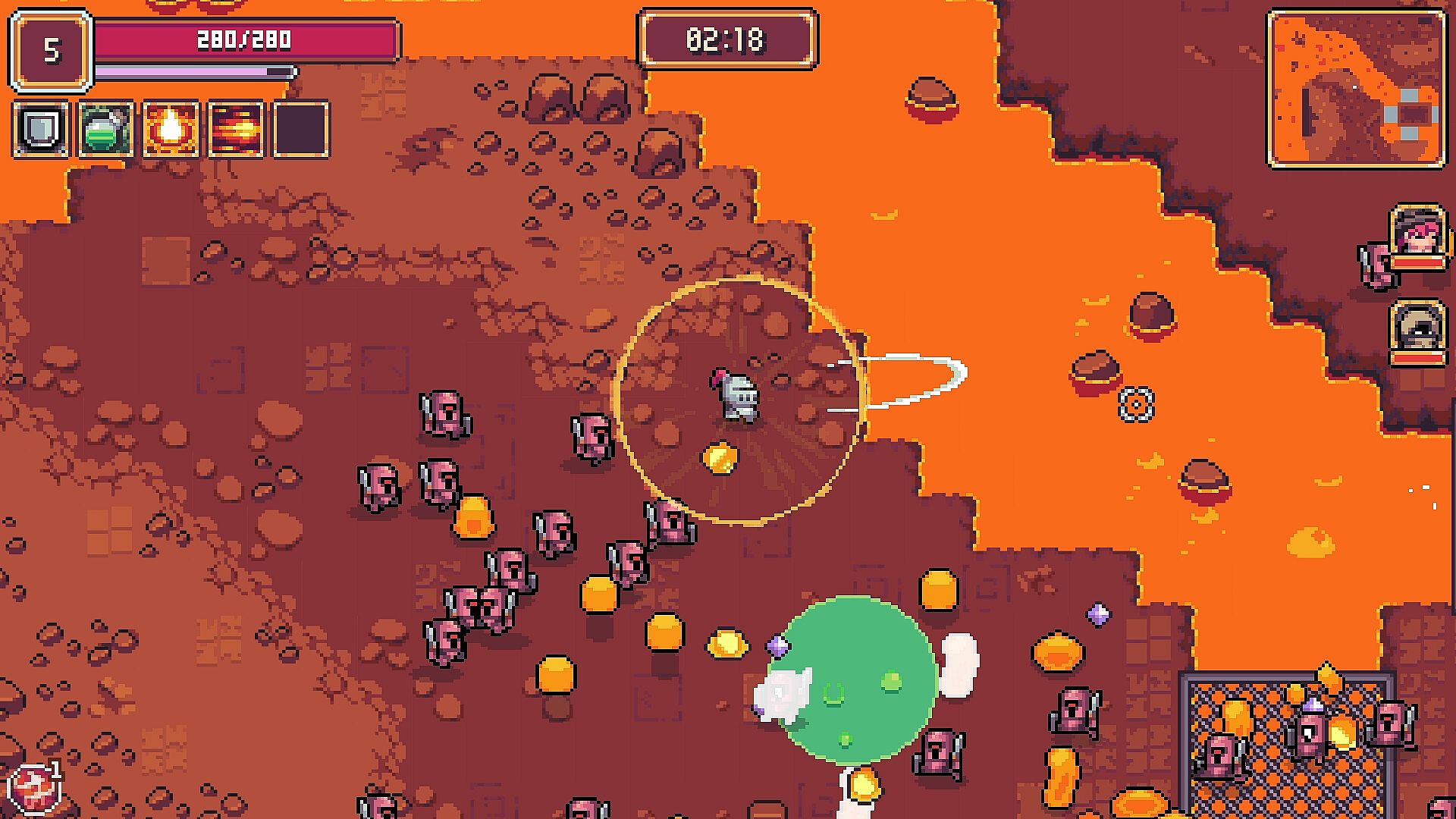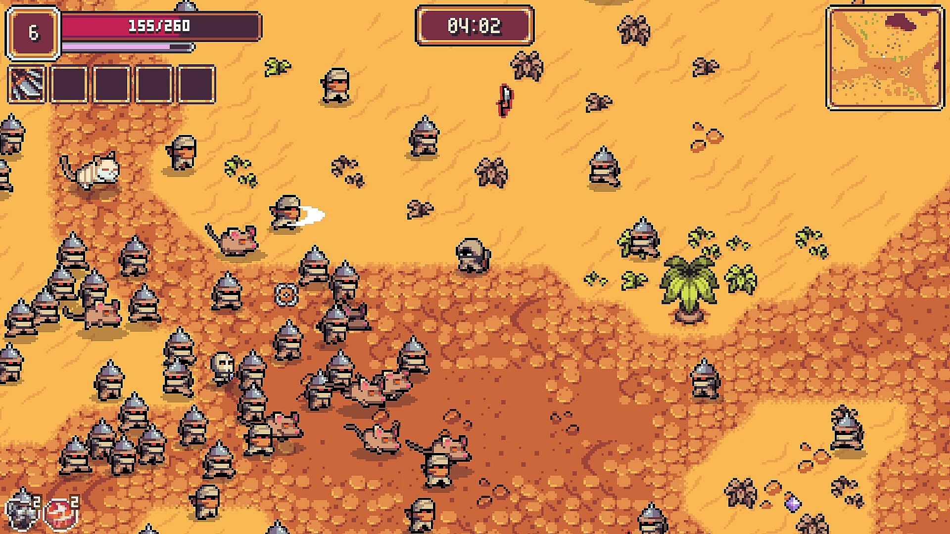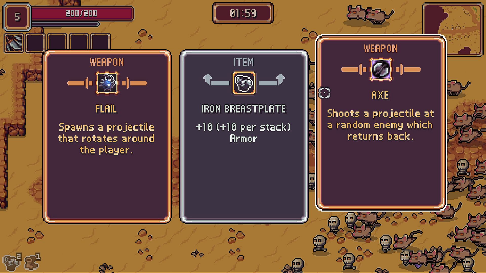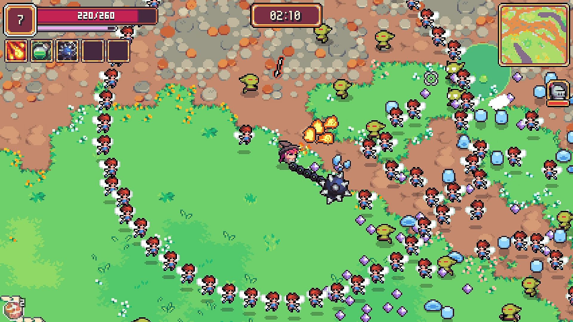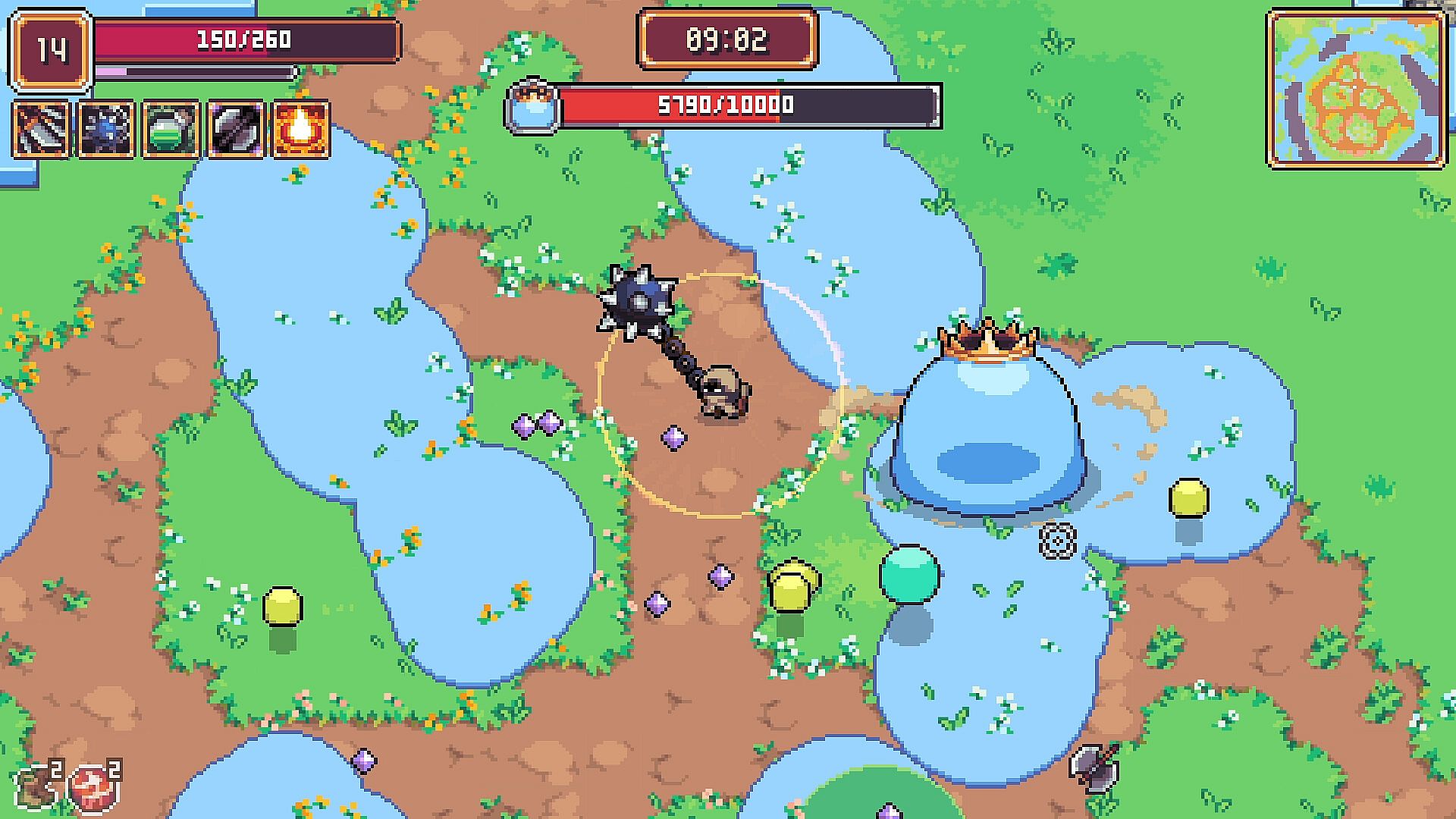 Each survivor brings a unique weapon and ability to the battlefield. Collect and upgrade various items to customize your playstyle. Wield lances, throw bombs, and shoot magic missiles to defeat enemies! Gather powerful, build-changing feats, and evolve your weapons to take your build to the next level!