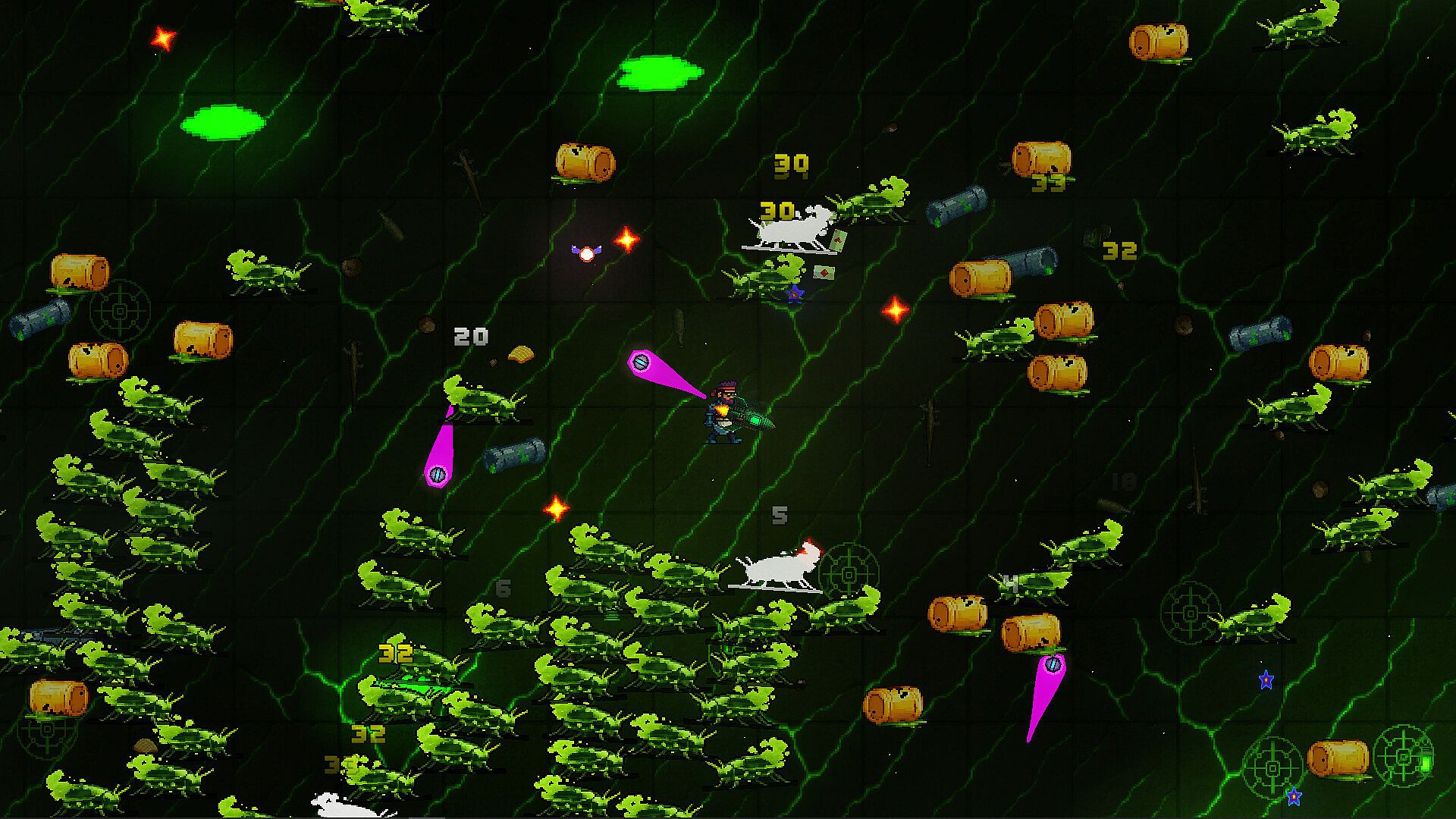 Stylized pixel art with high-contrast, flashy effects