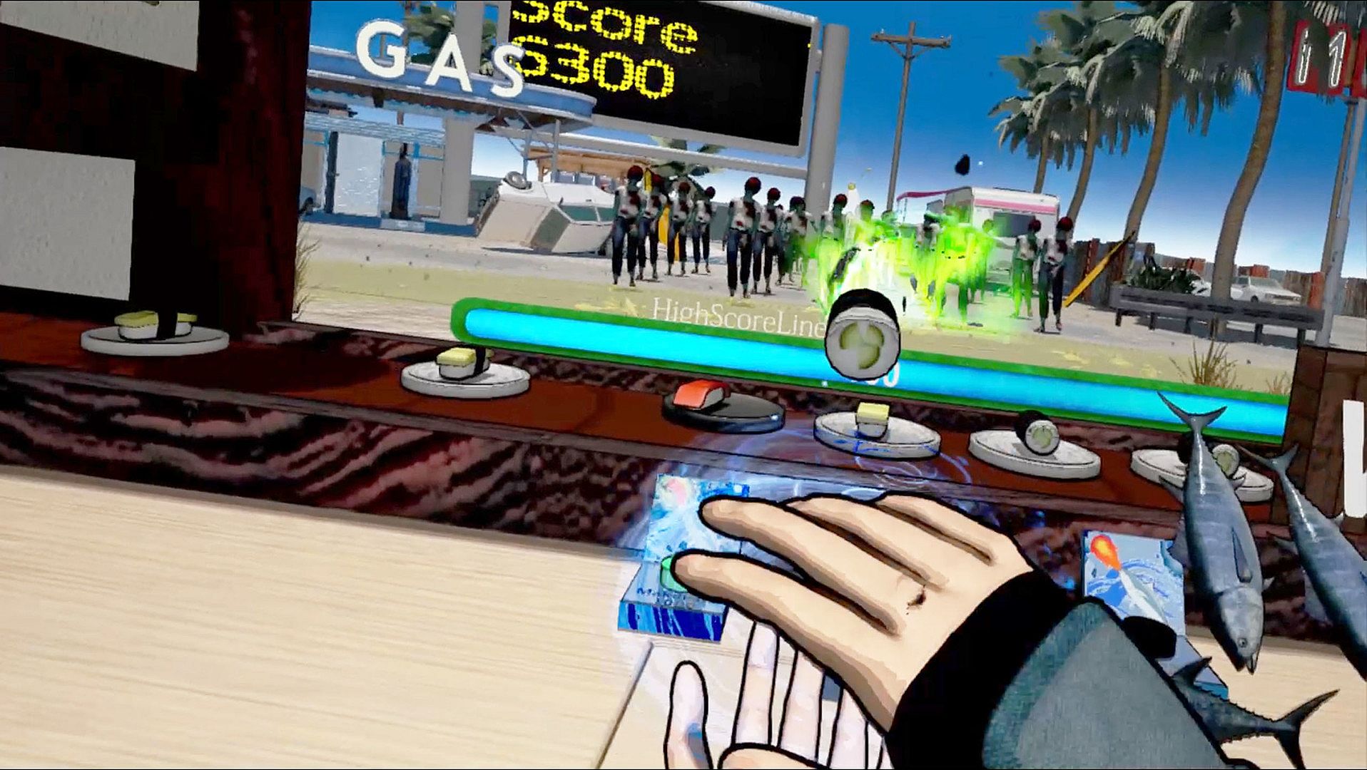 • Throw pieces of wasabi-laden sushi like ninja stars into the mouths of approaching zombies!