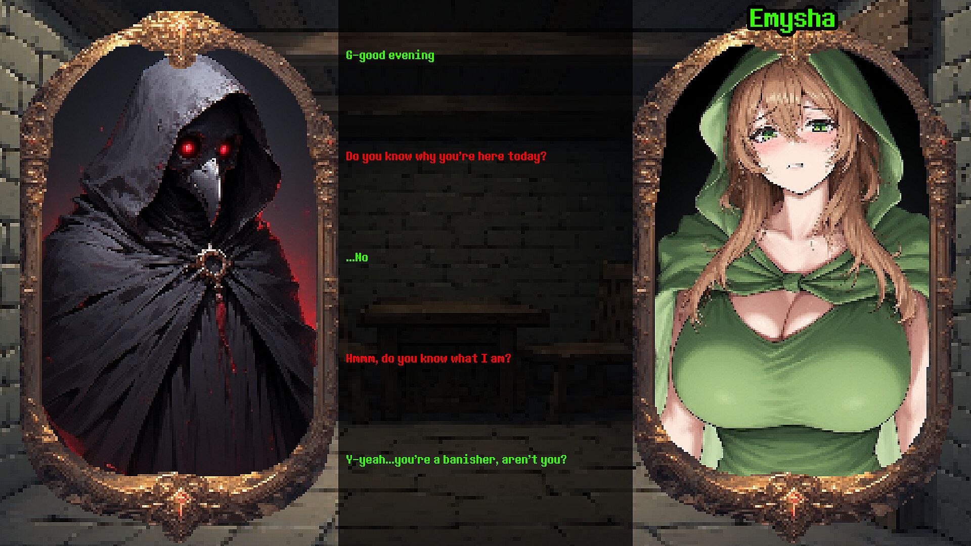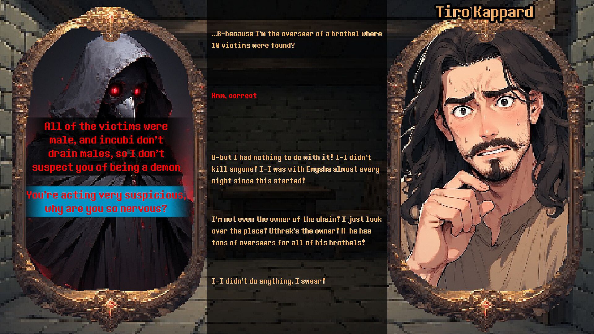 Despite succubus-related deaths gradually declining over the past few years, a sudden spike in victims has been reported in the city of Damaros, the third-largest city in the Kingdom of Iralo, and the city’s lord has requested your services. It is now up to you to weed out the succubi terrorizing the paranoid citizens of Damaros. Some succubi can shapeshift and perfectly imitate their targets, so it is up to you to uncover discrepancies in the stories of those you interrogate.