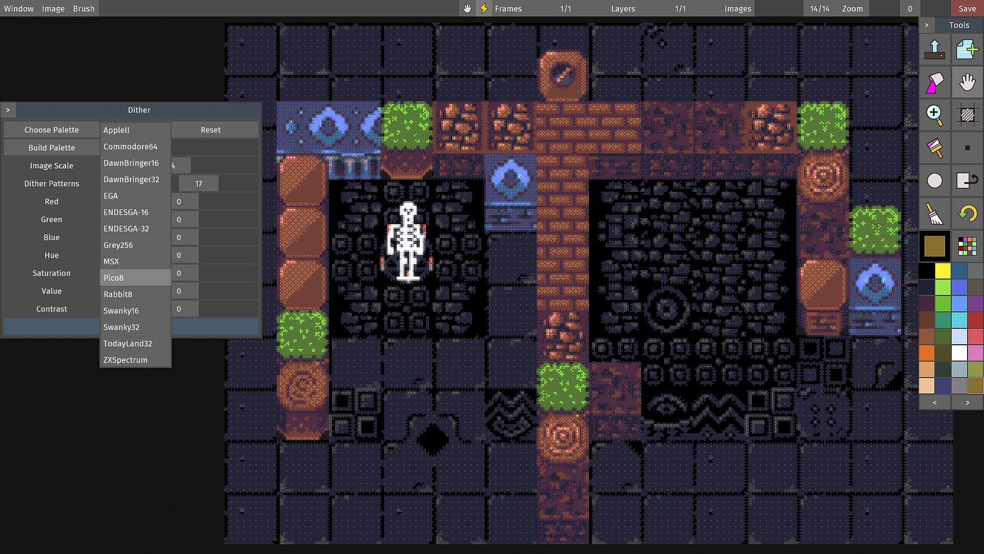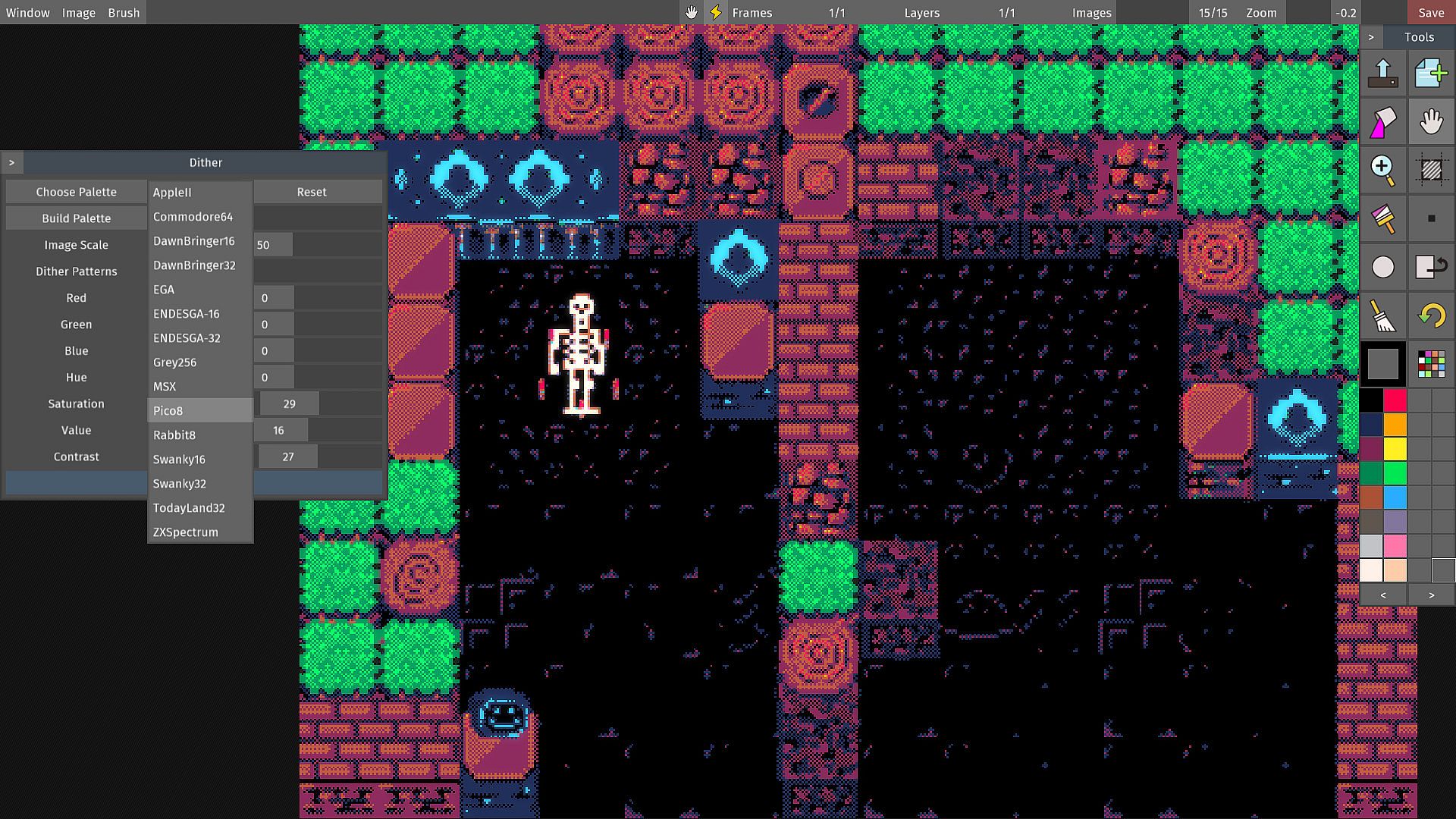 However, as times goes by, we find an increasing need for an actual replacement that is not only up-to-date but more importantly, cross platform (Linux/Win/Raspi/Android/Mac). So here is our attempt at recreating our favourite paint package for today's generation of pixel artists.