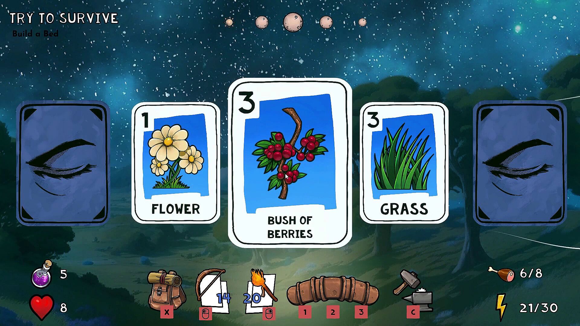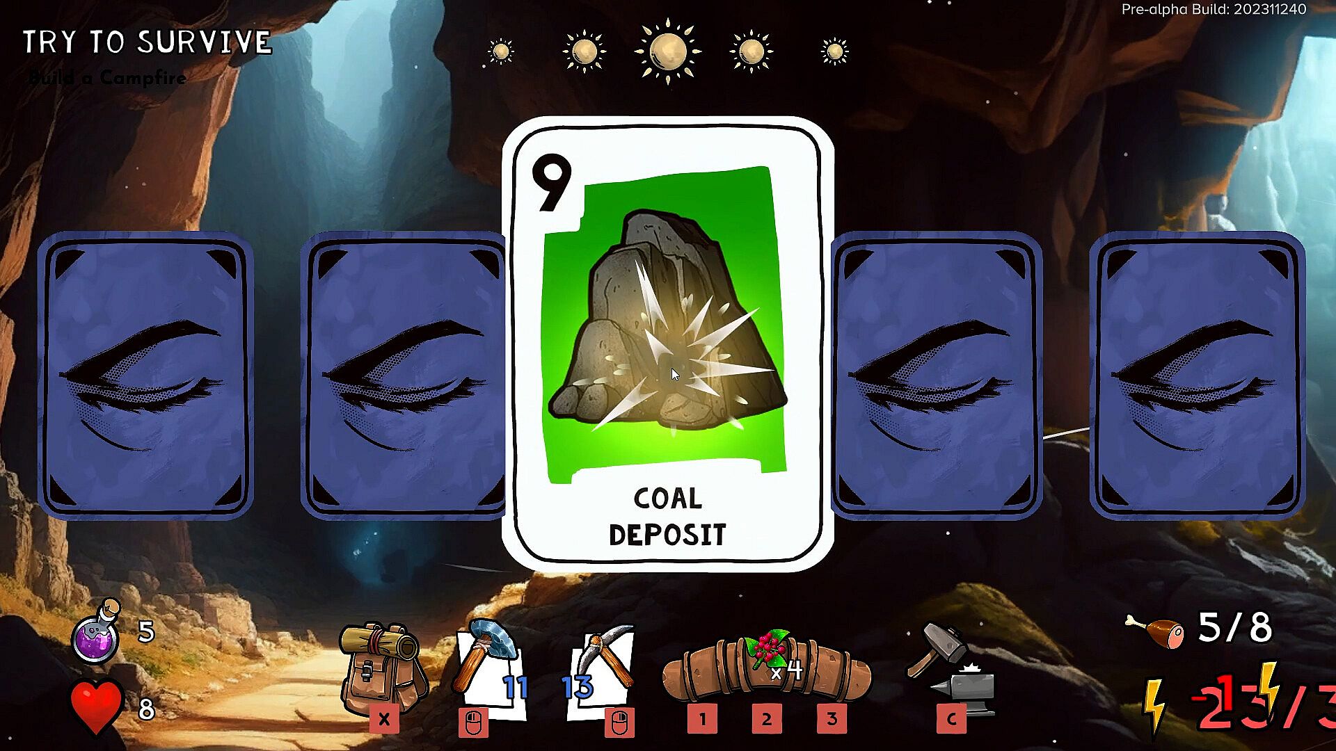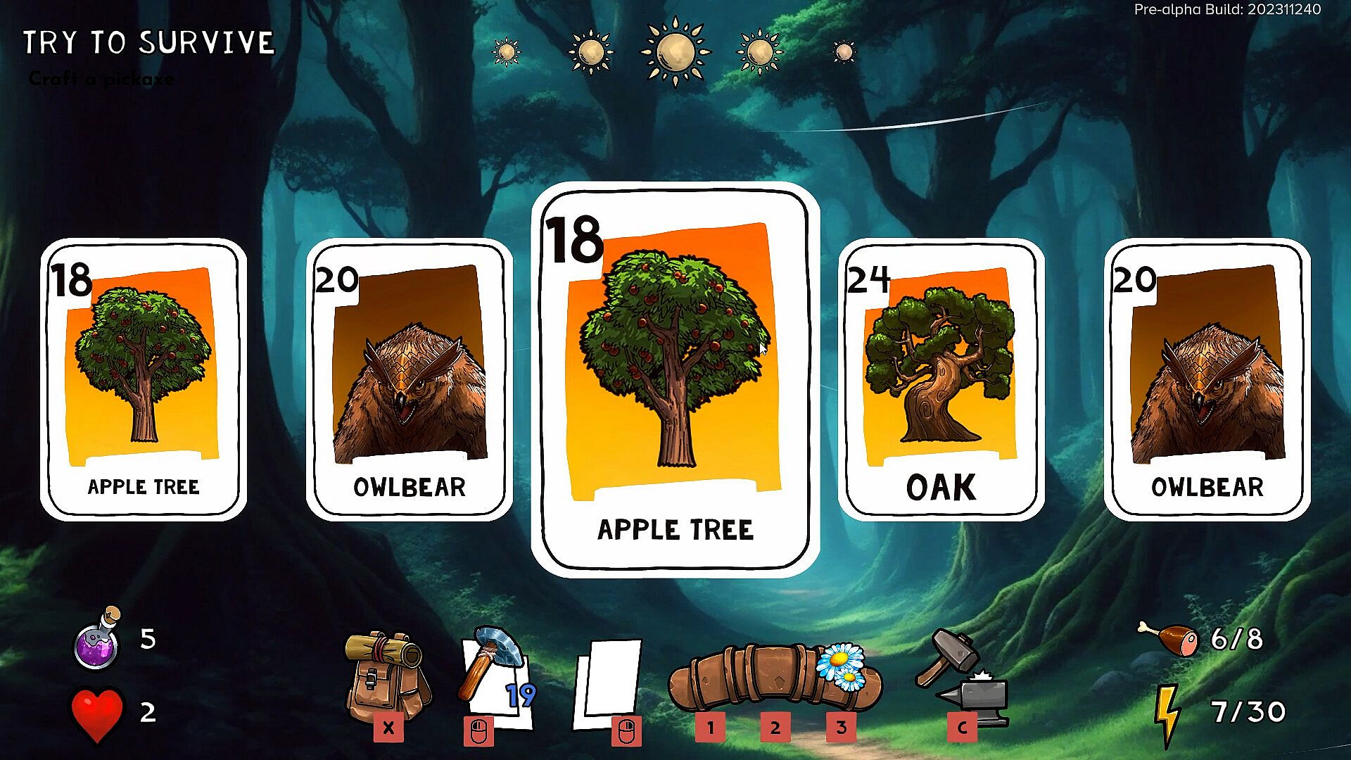 You can collect resources by interacting with the central card and dropping its interaction points to 0. But be careful: you will need tools such as an axe to chop down trees or a pickaxe to mine.SURVIVE