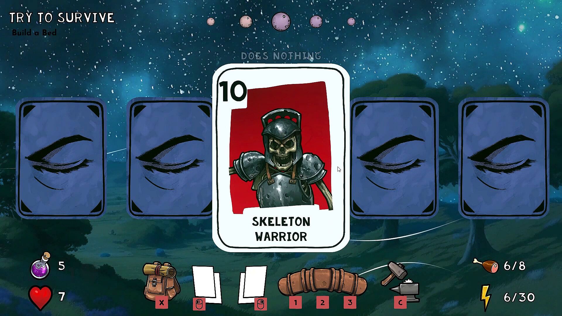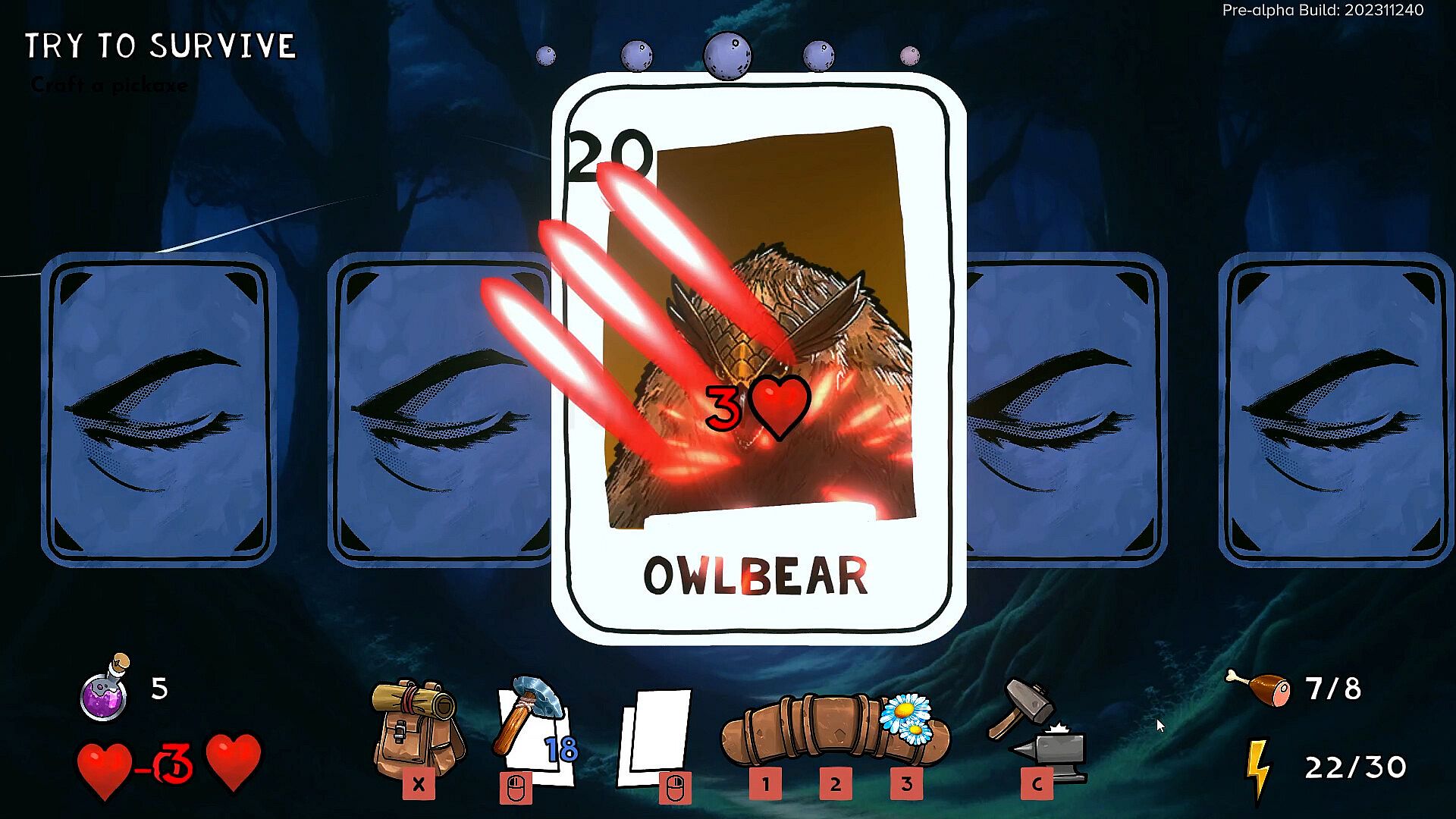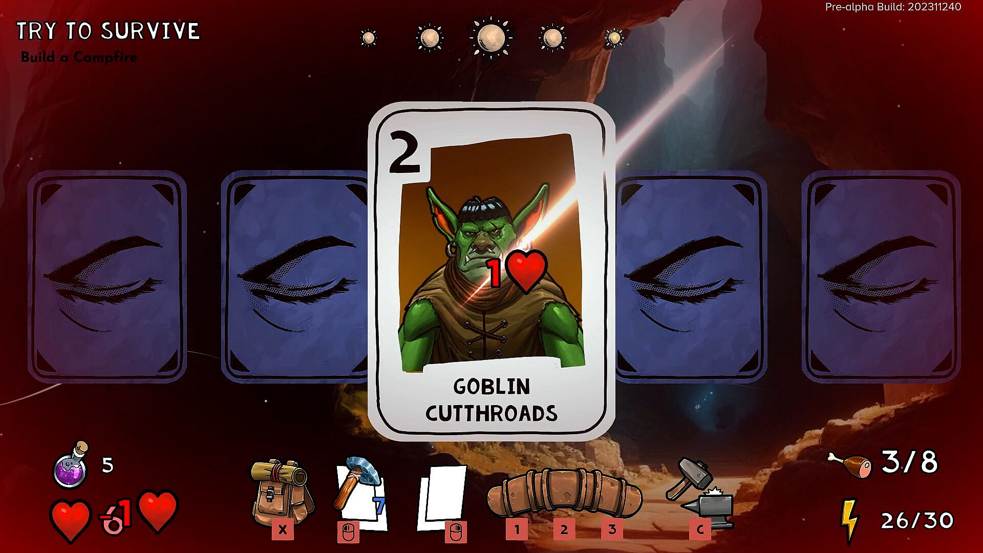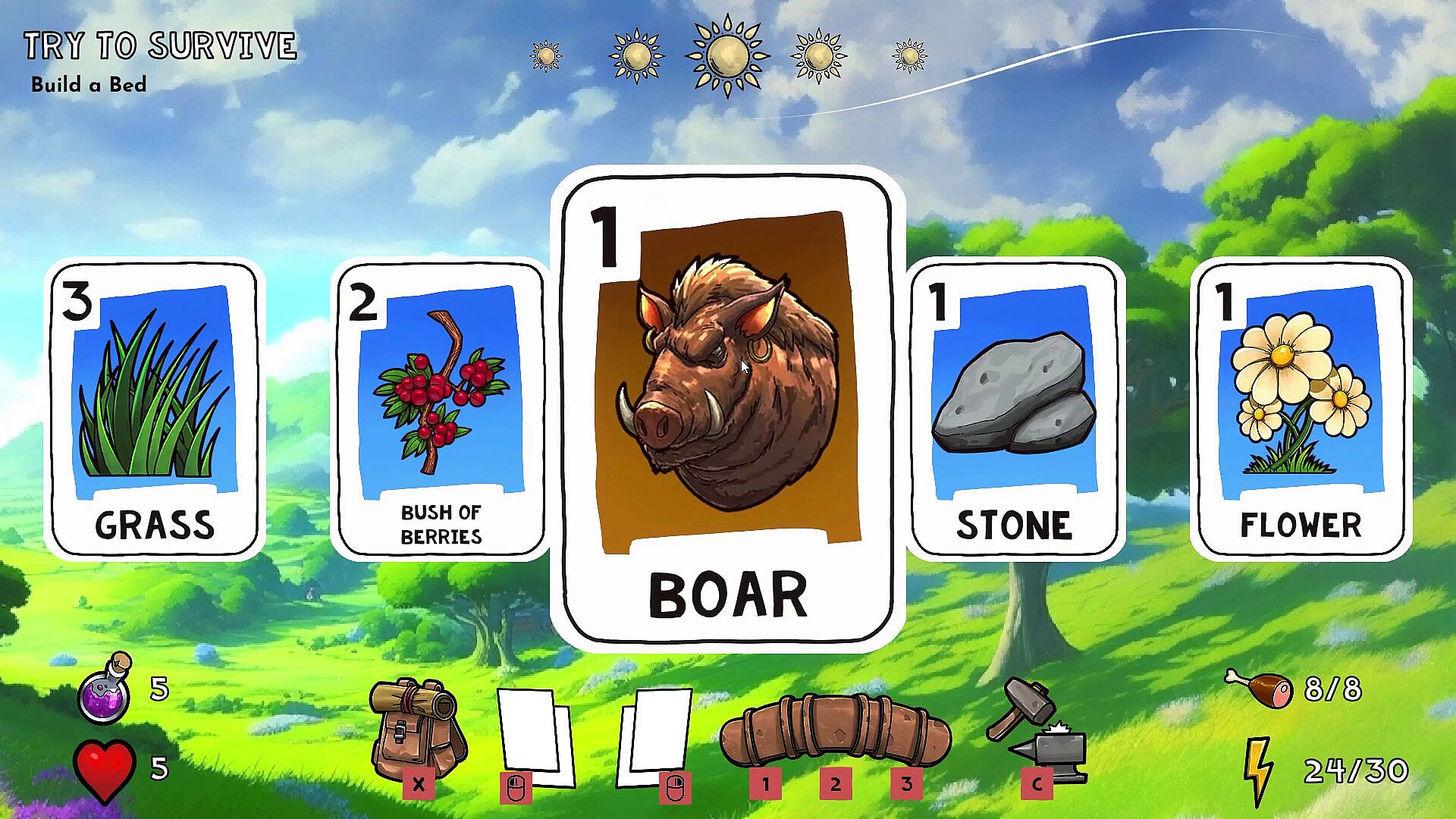 You can collect resources by interacting with the central card and dropping its interaction points to 0. But be careful: you will need tools such as an axe to chop down trees or a pickaxe to mine.SURVIVE