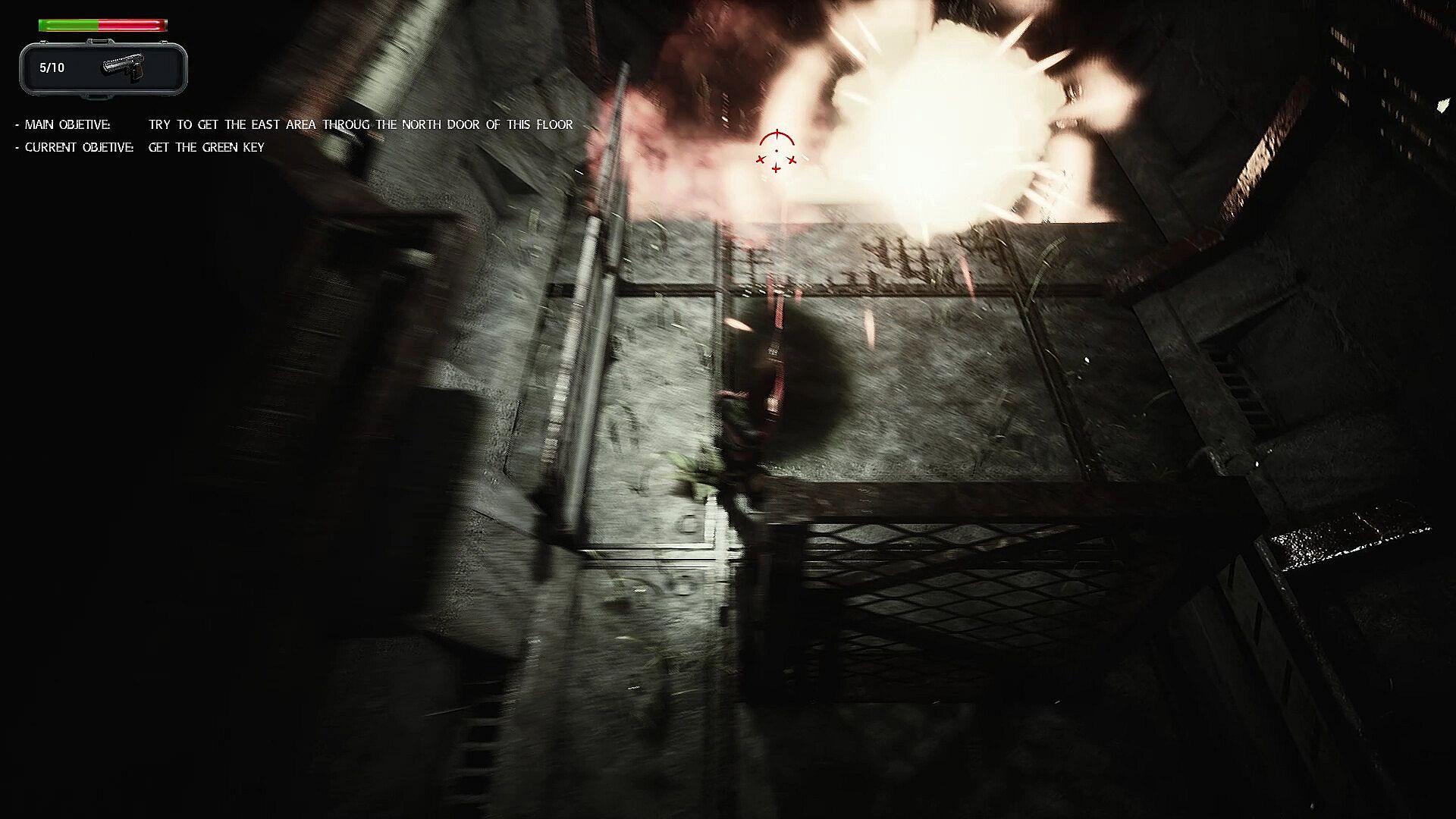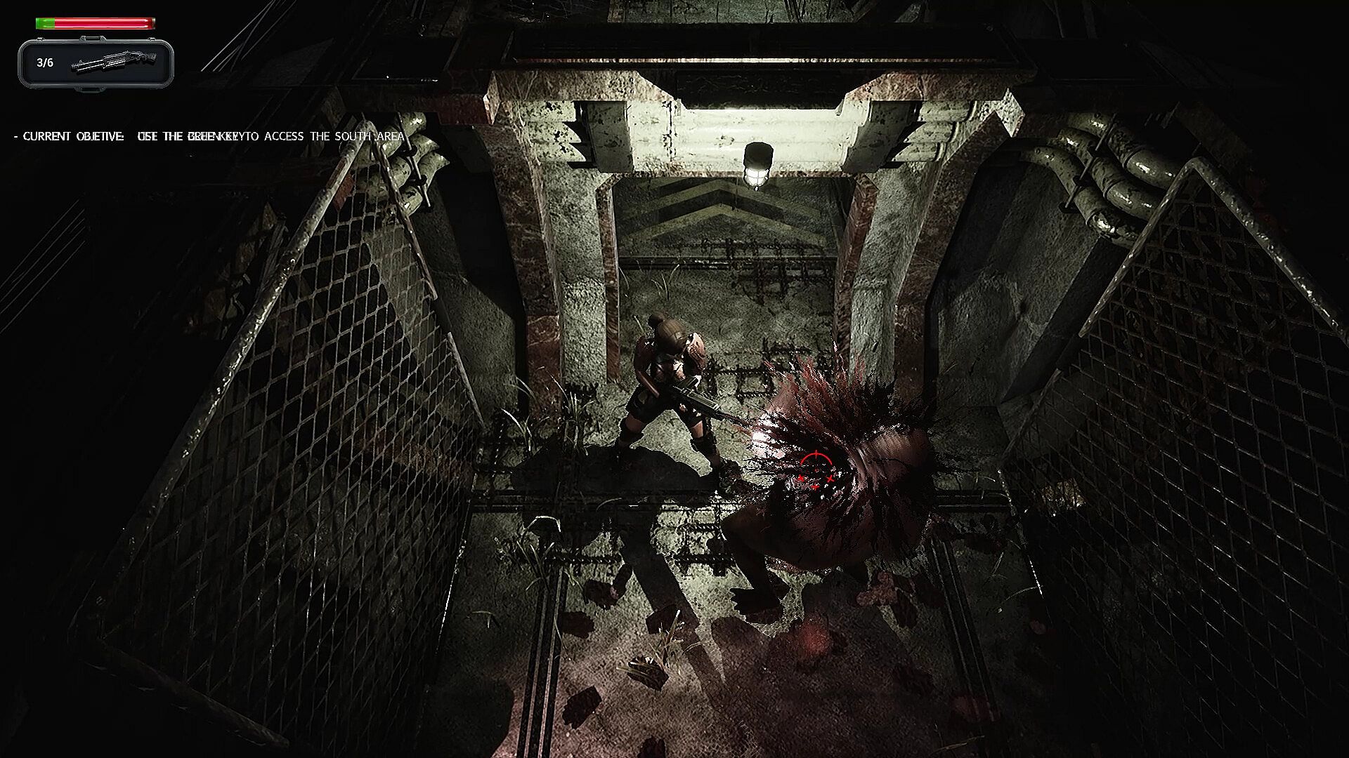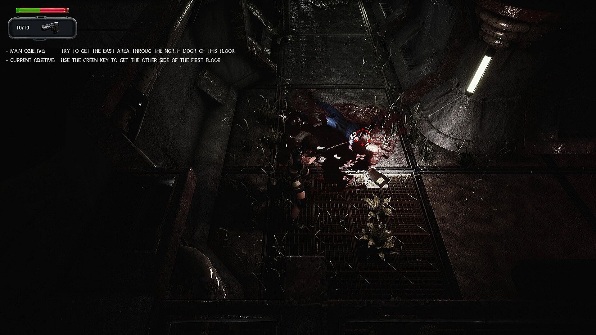Mainly from a Topdown view, but closer than usual, you have to explore claustrophobic and dark environments without any map references. In specific areas, the normal camera will be changed to a fixed camera. In order to advance you need to solve puzzles, push or drag objects, climb, jump and run. You'll face enemies that can surprise you in the most unexpected corners and that you shouldn't underestimate even if you think you'll have already killed them with the next shot. To help you on your adventure, you can collect medkits and ammo. You'll need to search for keys, activate switches, and search for information in order to progress through the adventure. At the moment you have your starting weapon and another weapon that you will have to find a way to access.