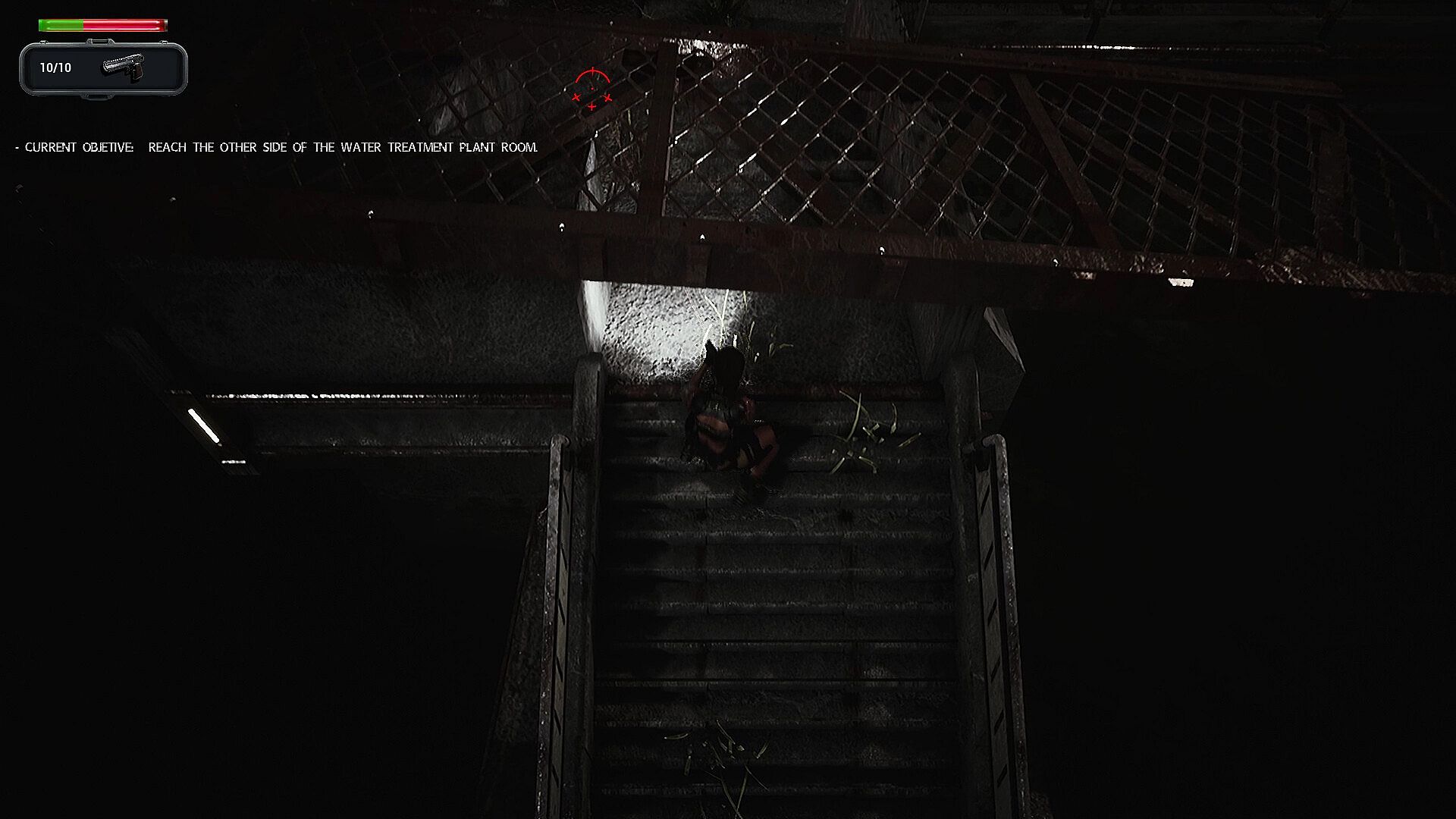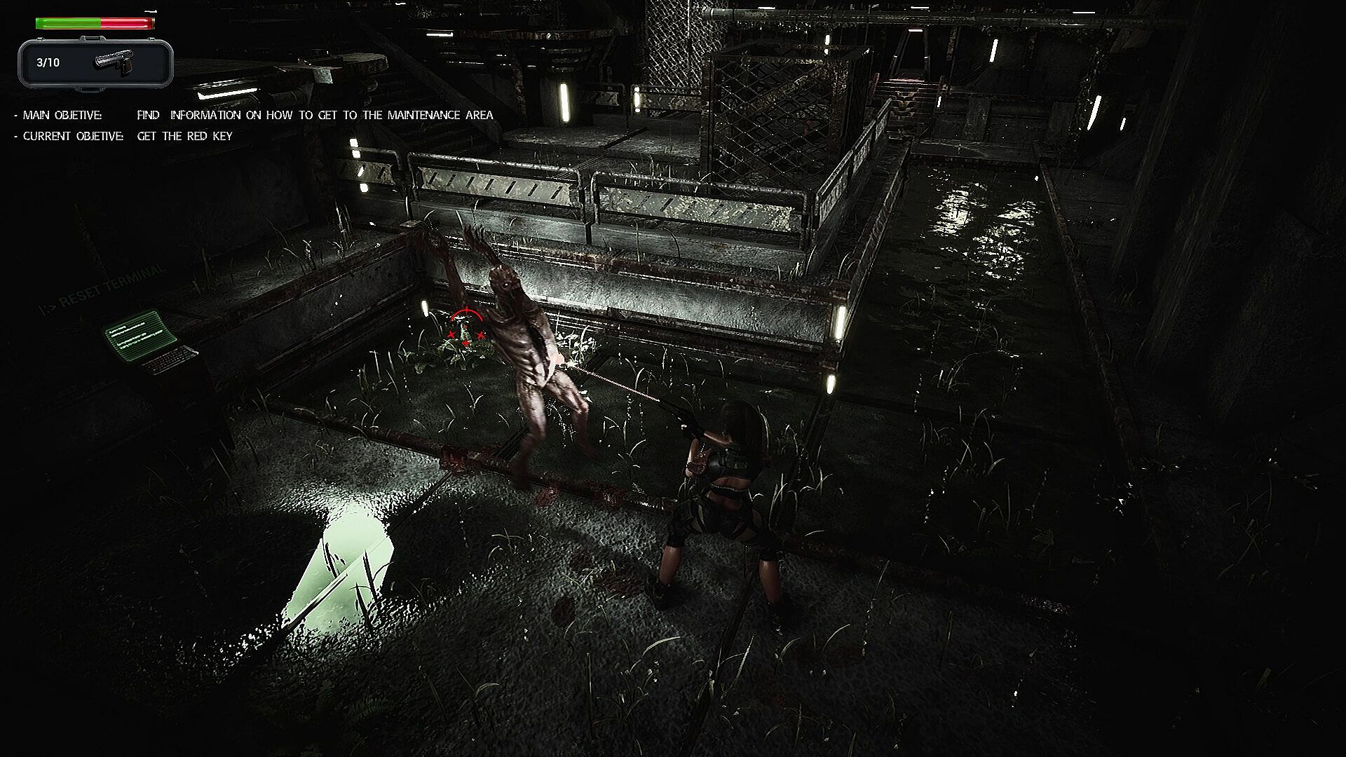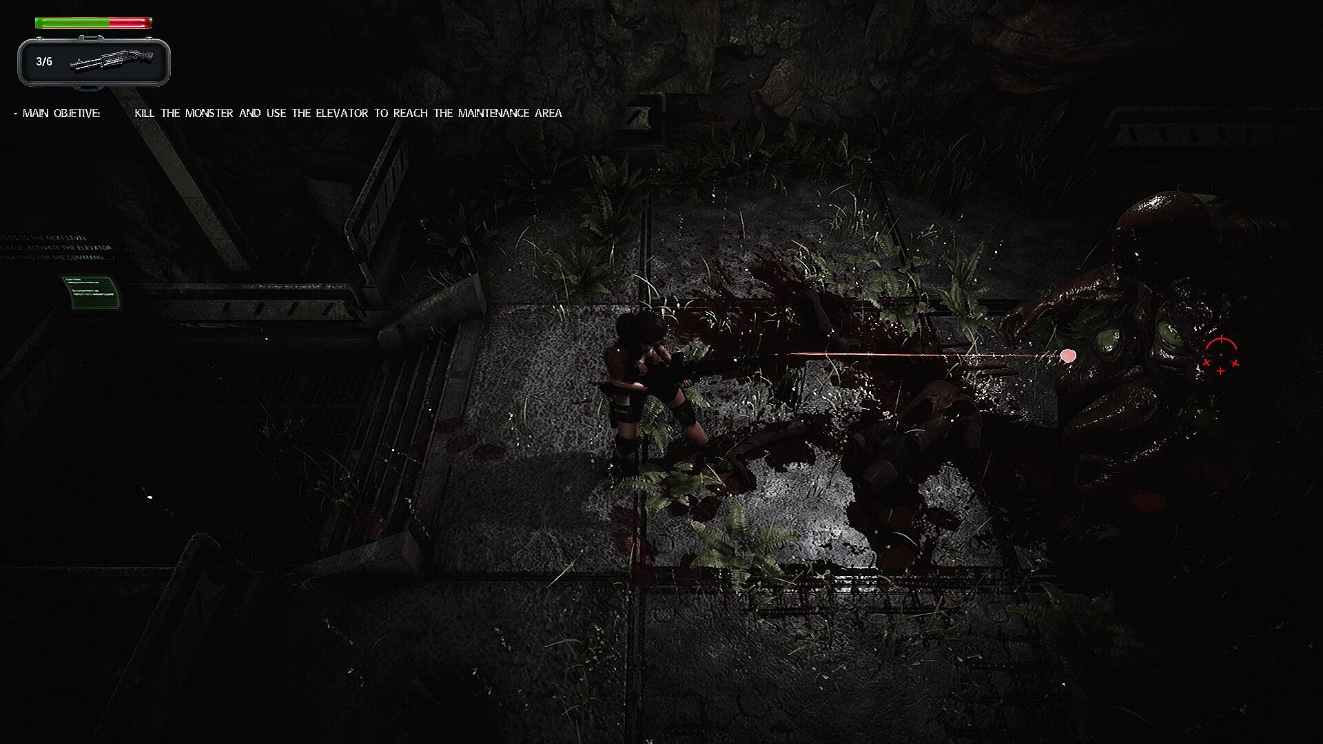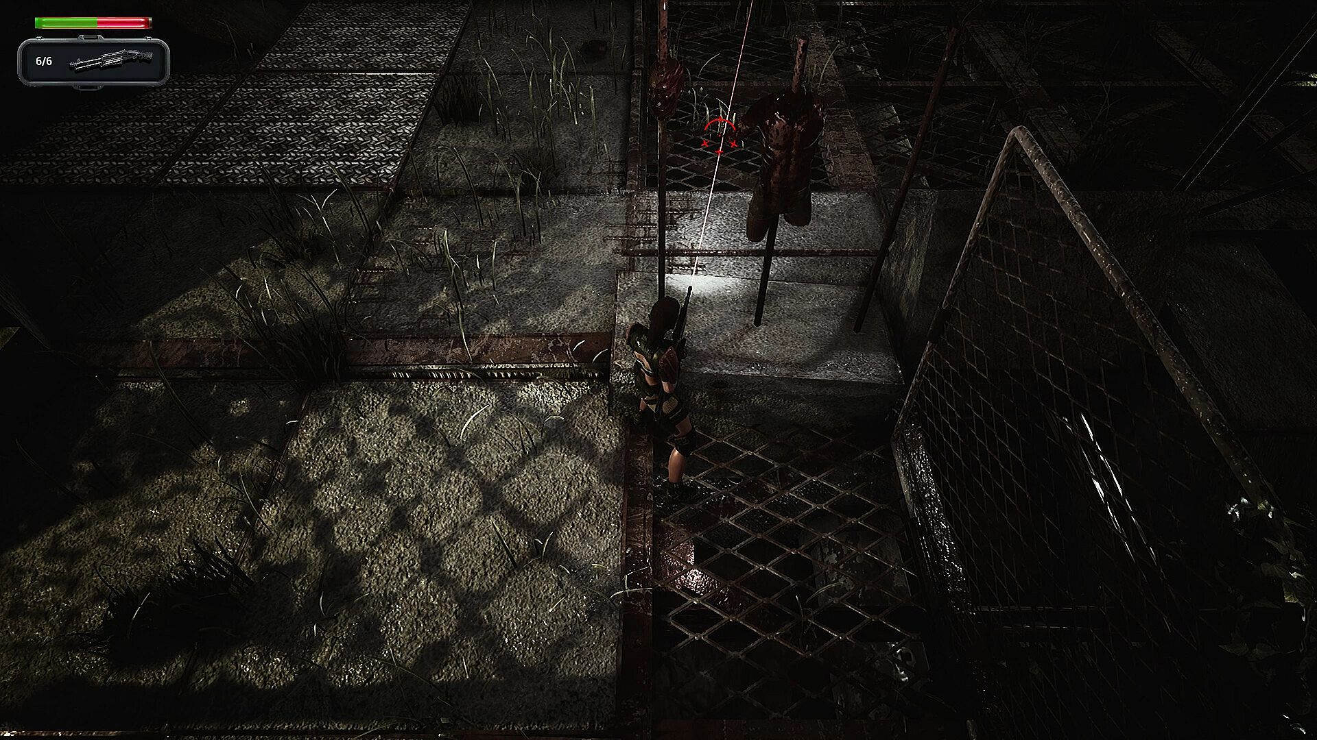 Mainly from a Topdown view, but closer than usual, you have to explore claustrophobic and dark environments without any map references. In specific areas, the normal camera will be changed to a fixed camera. In order to advance you need to solve puzzles, push or drag objects, climb, jump and run. You'll face enemies that can surprise you in the most unexpected corners and that you shouldn't underestimate even if you think you'll have already killed them with the next shot. To help you on your adventure, you can collect medkits and ammo. You'll need to search for keys, activate switches, and search for information in order to progress through the adventure. At the moment you have your starting weapon and another weapon that you will have to find a way to access.