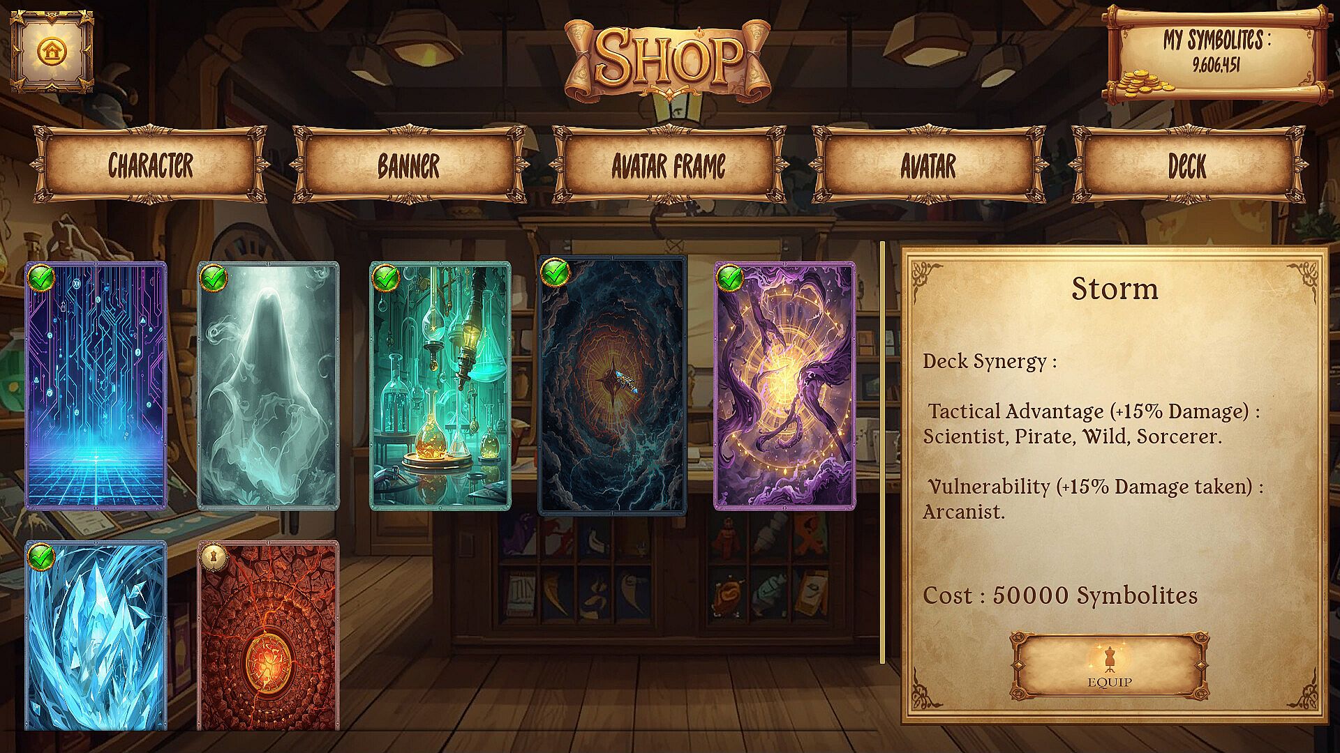 Symbolika features a completely free shop, guaranteed without any microtransactions. The only currency in the game is SYMBOLITE, which you earn by the sweat of your brow by defeating your adversaries. The further you go in your run, the more SYMBOLITES and experience (EXP) you accumulate.