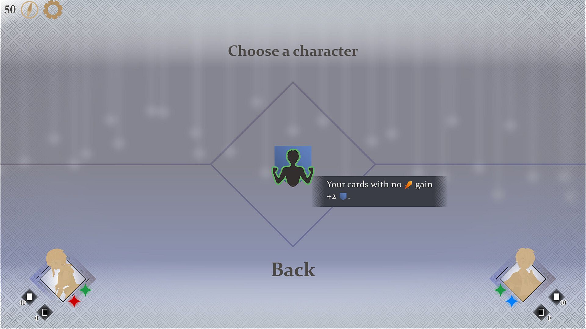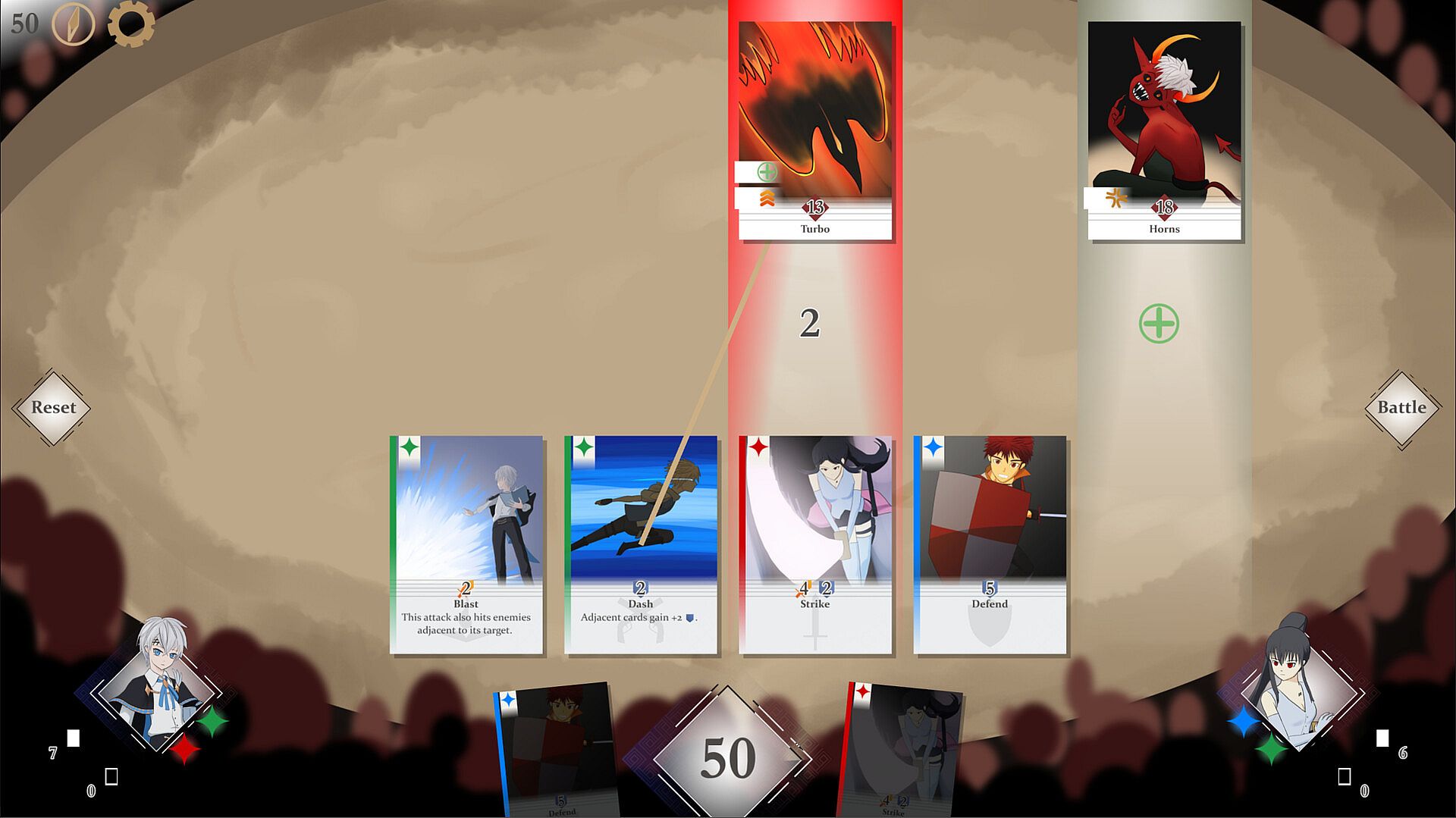 This game features a unique mana system that elevates your decision-making to the next level. When one character plays a card, the other character gets one mana. However, mana comes in different colors! Play the right cards in order to unlock stronger ones in your hand!