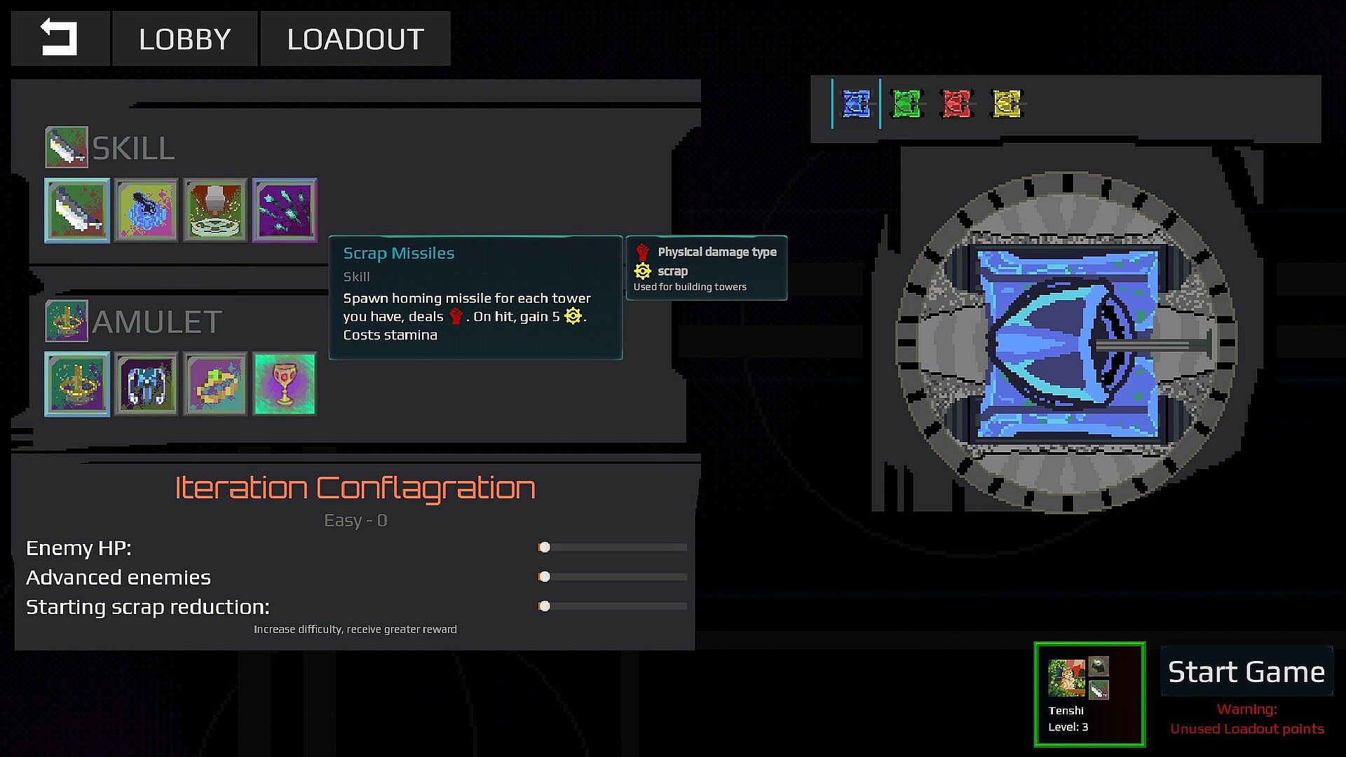 Before you enter the fray, choose your loadout - You will need to pick a Skill, Amulet and adjust your mech with the help of Systems! Choose wisely to help you overcome the obstacles ahead!