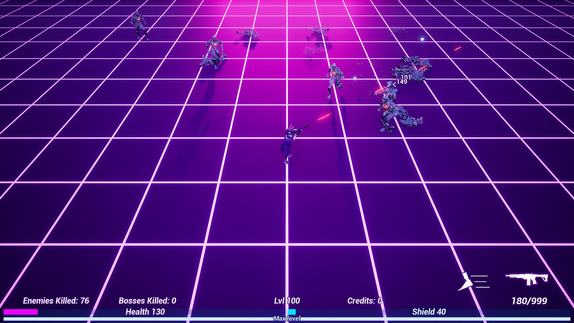 - Three different weapons to freely switch between: dual pistols, a laser rifle, and a shotgun.
