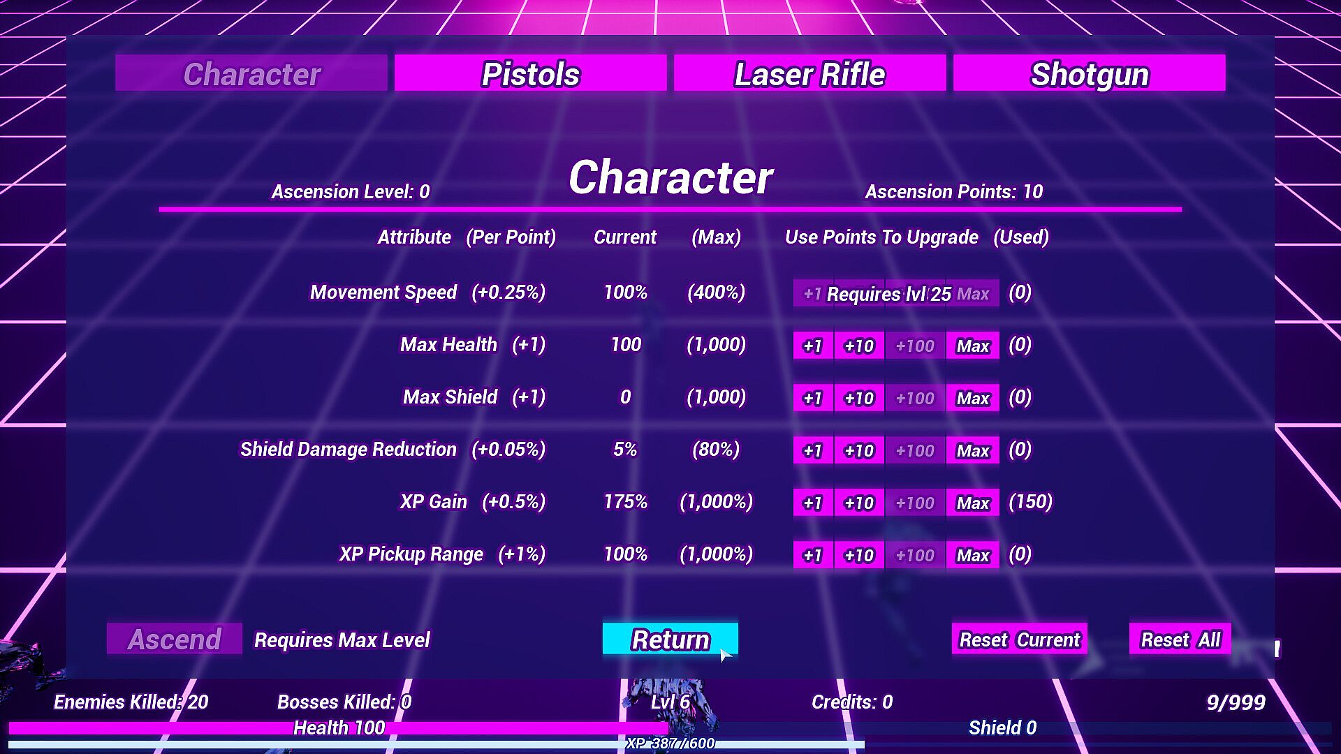 - An ability to temporarily give each weapon a special effect: dual pistols apply a slow effect to enemies, laser rifle applies a burn over time effect, and shotgun applies a knockback effect.