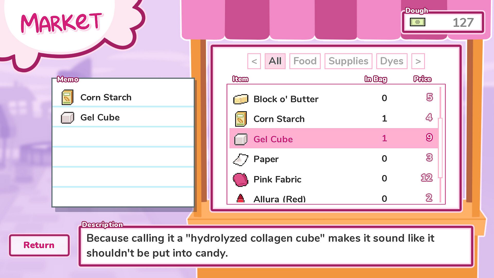 Once you return home, spend the evening crafting unique confections! Gumdrop will praise every one of your new creations~