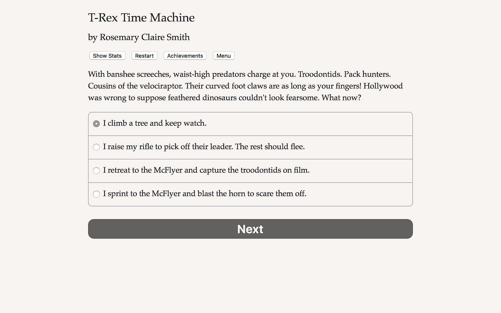 T-Rex Time Machine is a 170,000 word interactive adventure novel by Rosemary Claire Smith, where your choices control the story. It's entirely text-based—without graphics or sound effects—and fueled by the vast, unstoppable power of your imagination.
