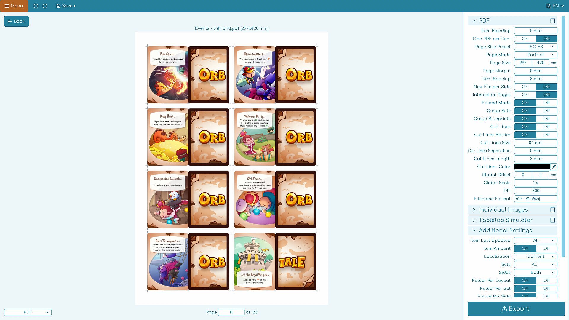 • Print and Play...: Get a printable PDF with proper bleeding, cut marks, foldable PnP, in any color format or paper size you want with just a click.