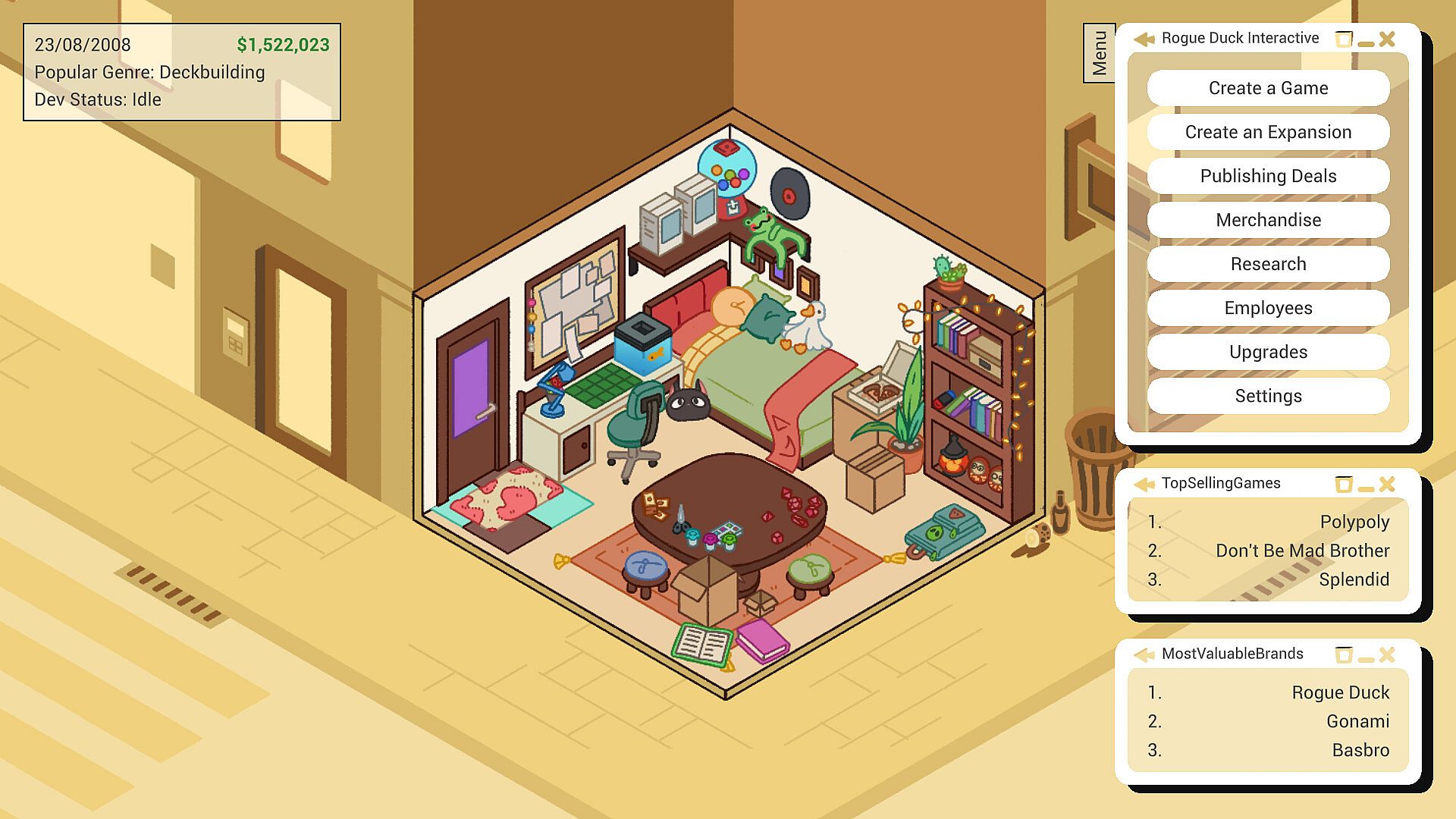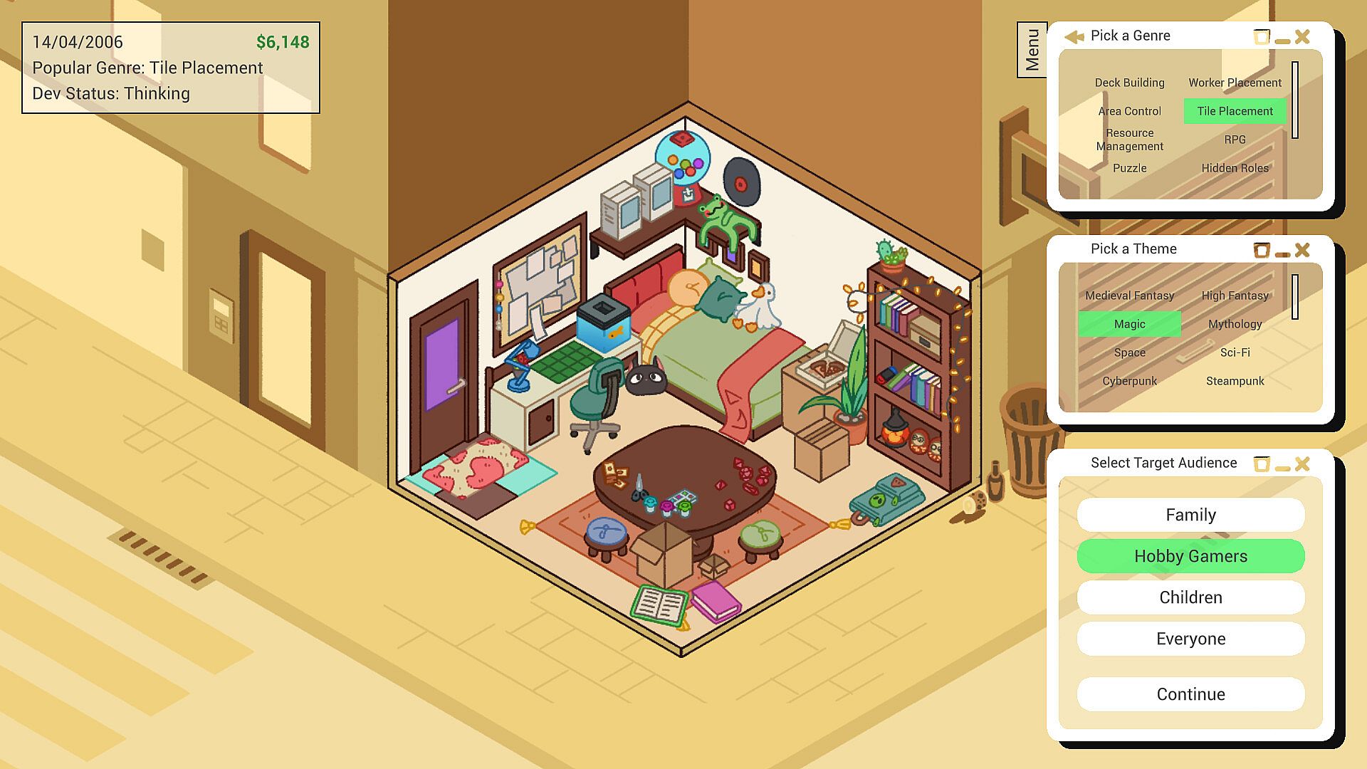 In Tabletop Inc., you start small — running a tiny tabletop game company from your own bedroom. Choose your genre and theme, develop your mechanics, and bring your ideas to life one piece at a time.