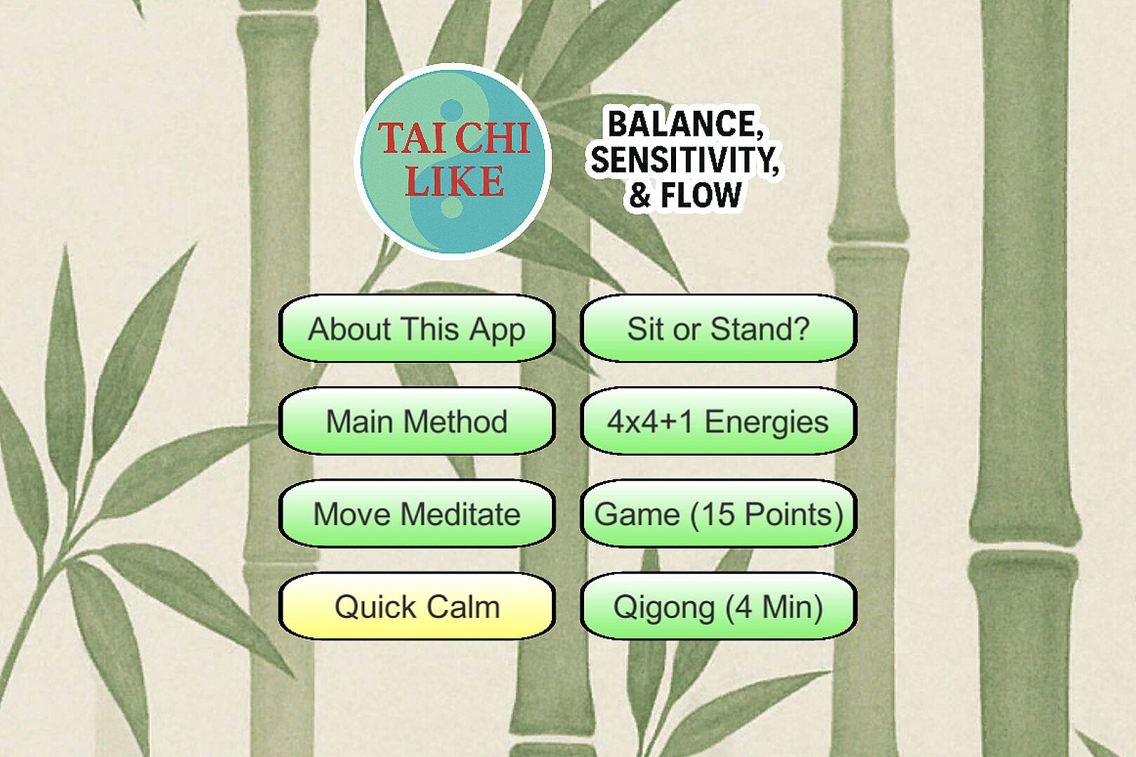 Tai Chi Like is your pocket guide to quick, mindful movement and meditation—no deep training required. In just five minutes, you’ll experience a randomized sequence of nine simple moves, each paired with a practical strategy to help you stay grounded, centered, and energized throughout your day. There is a button for Move Meditation, a game, Qigong, and Sleep/Study mode all based on the idea of 4 elements with different forms of expression.